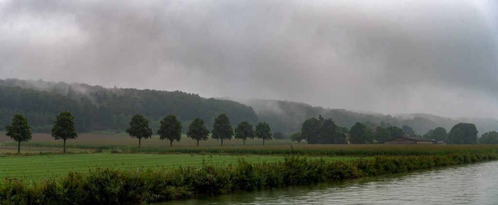 Op een van de dagen aan het Mittelandkanaal hangt ‘s morgens nog de mist tussen de heuvels van het Wiehengebergte dat voor een deel parallel loopt aan het kanaal.