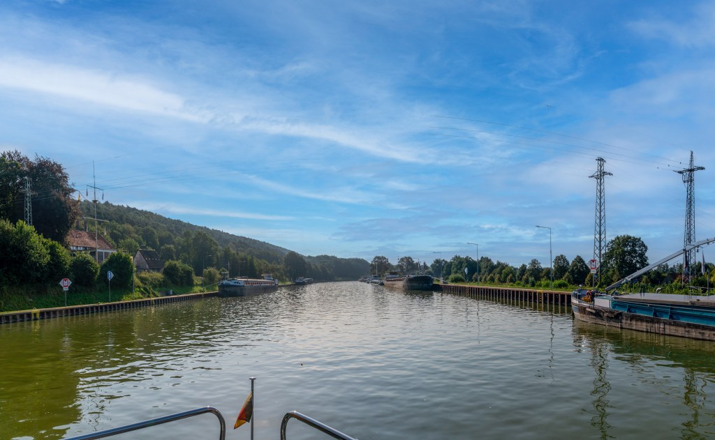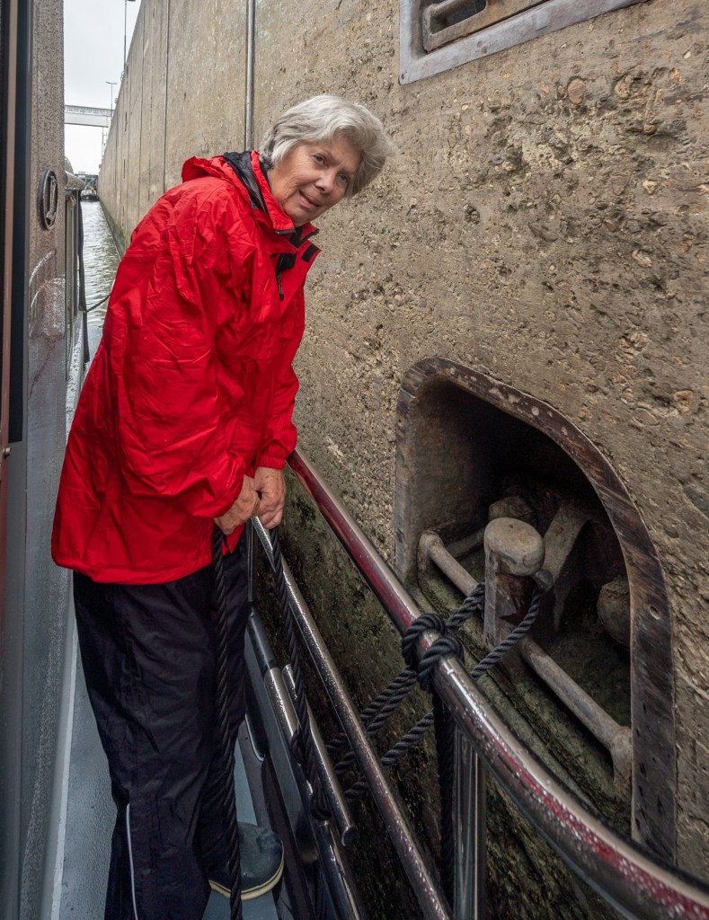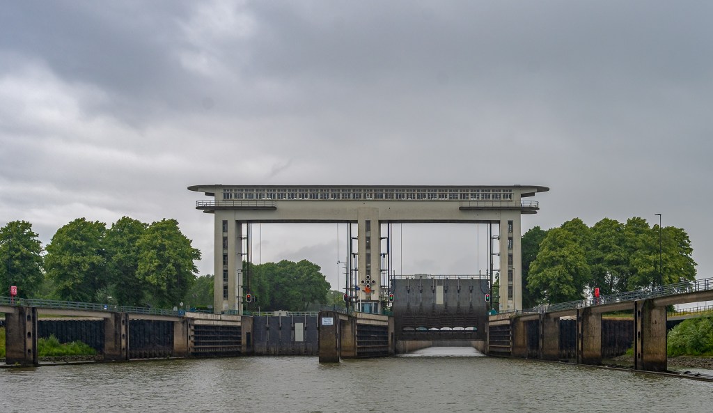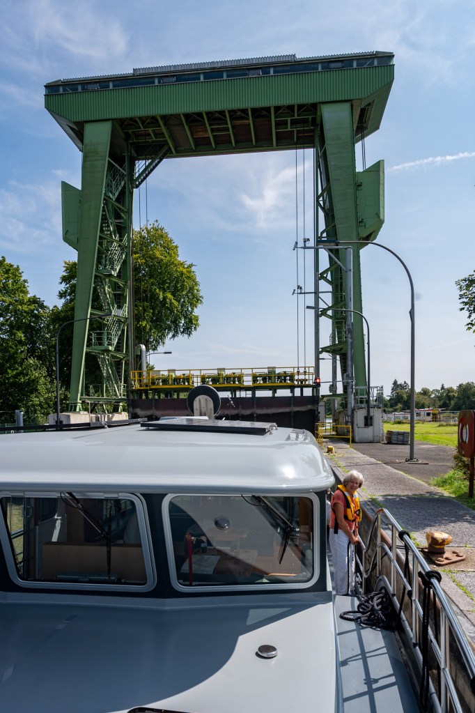 Op het Wesel Datteln Kanaal zijn er totaal 5 sluizen waar we telkens 6 tot 9 meter zakken. Zo komen we steeds dichter bij het niveau van de Rijn.