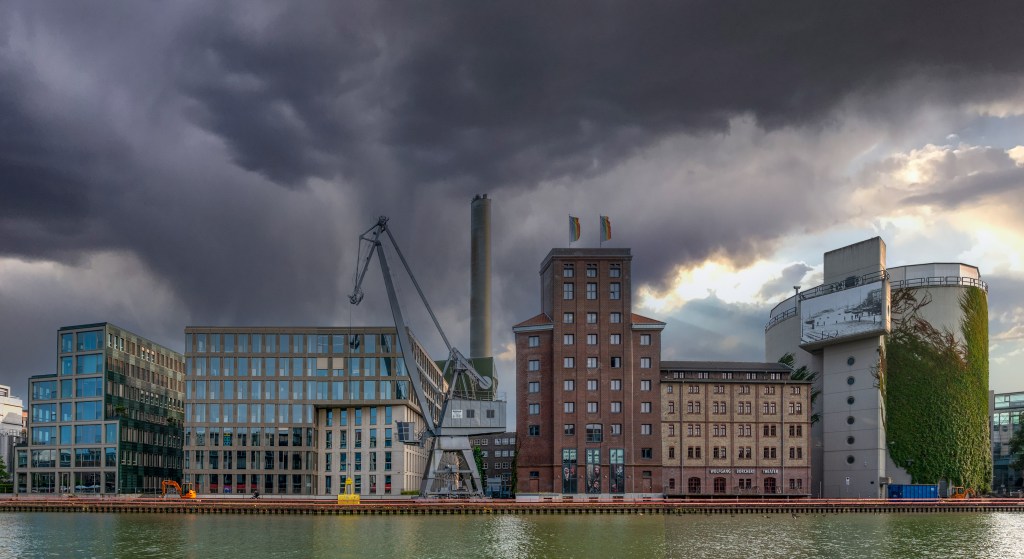 Vanuit het Wesel- Datteln Kanaal wacht ik op de kruising met de Rijn totdat er geen verkeer stroomafwaarts komt. Ik sluit achter het laatste schip aan dat stroomafwaarts 16,5 km per uur vaart. Tot de afslag naar de haven van Wesel. Daar draai ik,, met behulp van de boeg- en hekschroef, scherp rechts en vaar terug stroomopwaarts de haven in. Gelukkig is de havenmonding ruim genoeg.