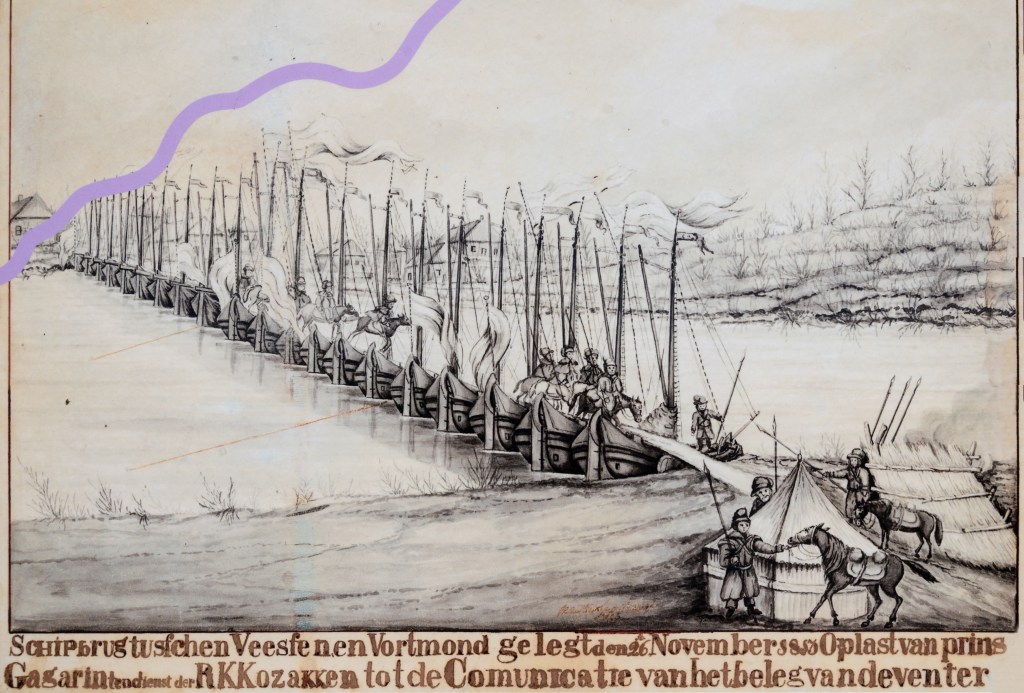 Schipbrug bestaande uit veel Kozakken in bootjes.