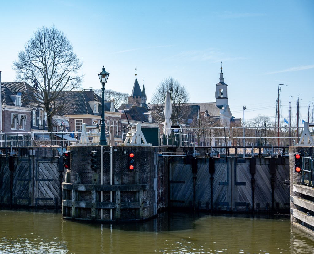 Een kerk en een molen langs de Lek, de kerk van Schoonhoven. Daaronder de Prinses Beatrixsluizen in het Lekkanaal