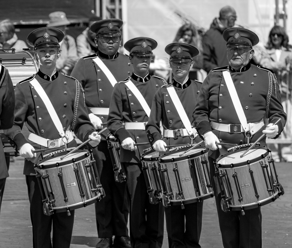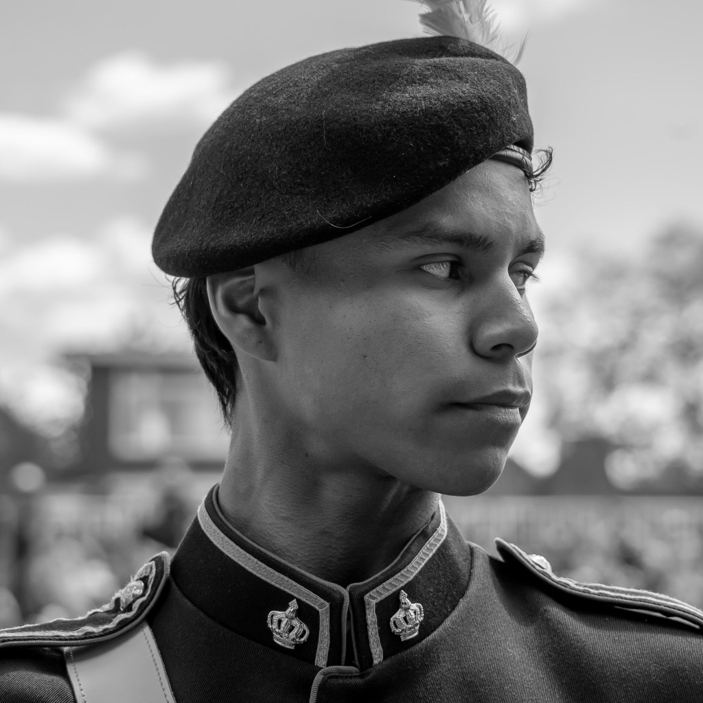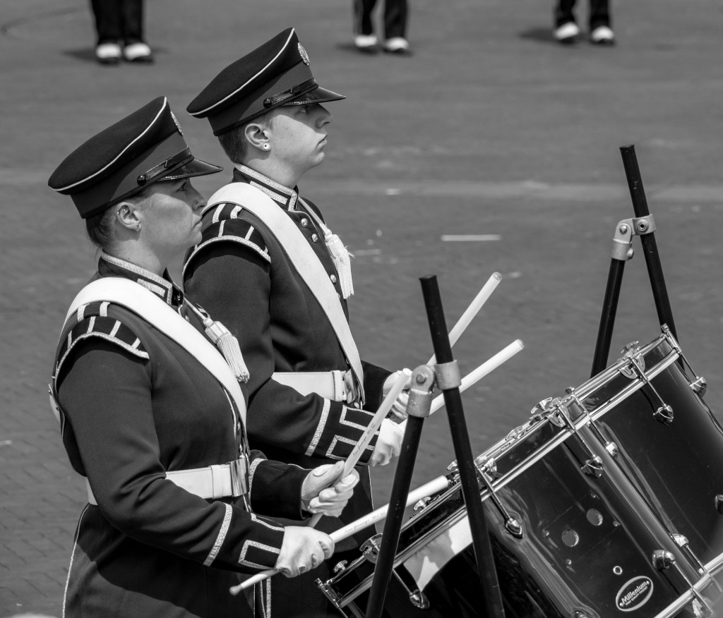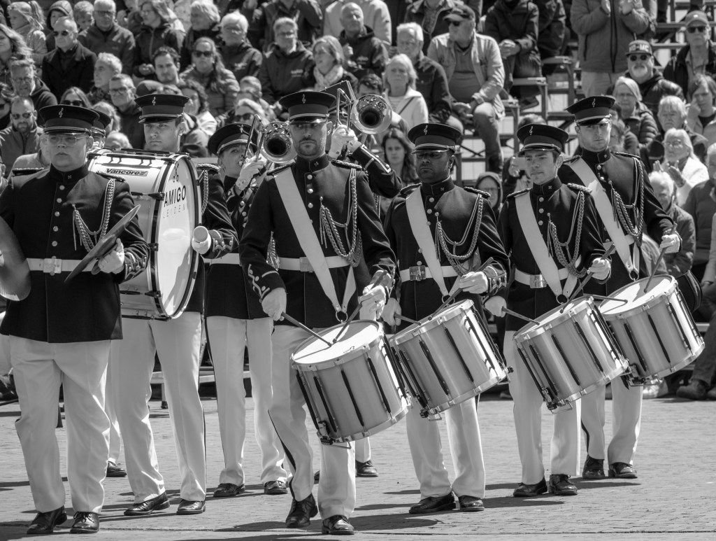 We liggen met konings- en bevrijdingsdag in Leiden. Er is een uitgebreide rommelmarkt op de Hooglandsekerkgracht en in de Breestraat. Bij de molen is er een taptoe waar ik strakke gezichten van de muzikanten schiet. We gaan als vanouds bij het Prentenkabinet eten, ditmaal met Hilda en Nico die ons met een bezoek vereren. Frank en Ineke komen eten op Tiberius wat reuze gezellig is.