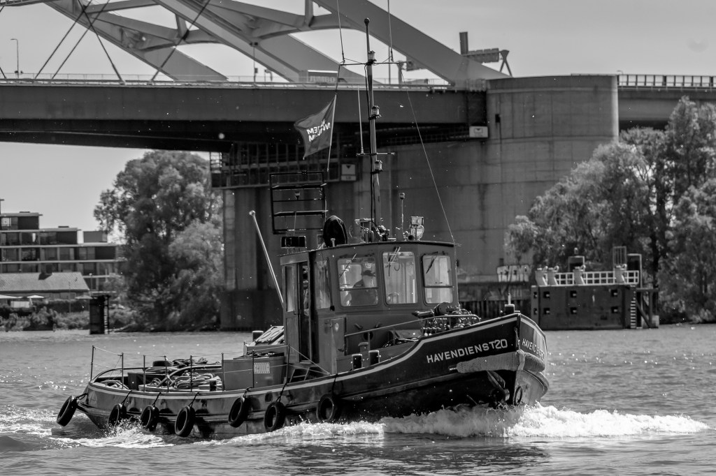 Onderweg naar Rotterdam passeren we de Stormvloedkering in de Hollandse IJssel. Een iconisch gebouw van architect Johan van der Steur uit 1958 waar we zomaar onderdoor mogen varen. Als we de Nieuwe Maas afvaren zien we de Brienenoordbrug waar we samen met een aantal vrachtvaarders tegelijk onder door gaan. Een oud slepertje met een nog oudere kapitein vanuit de museumhaven, loopt met ons gelijk op.