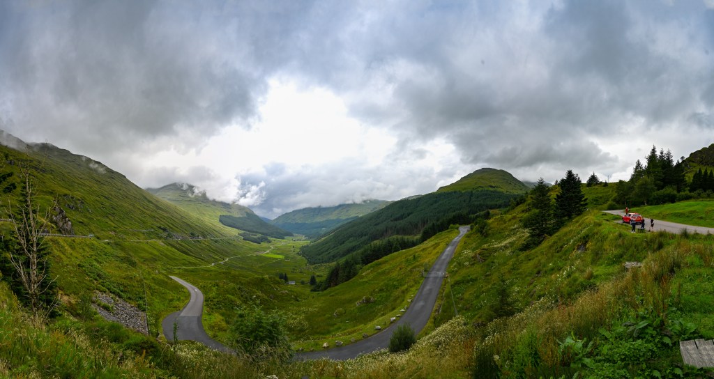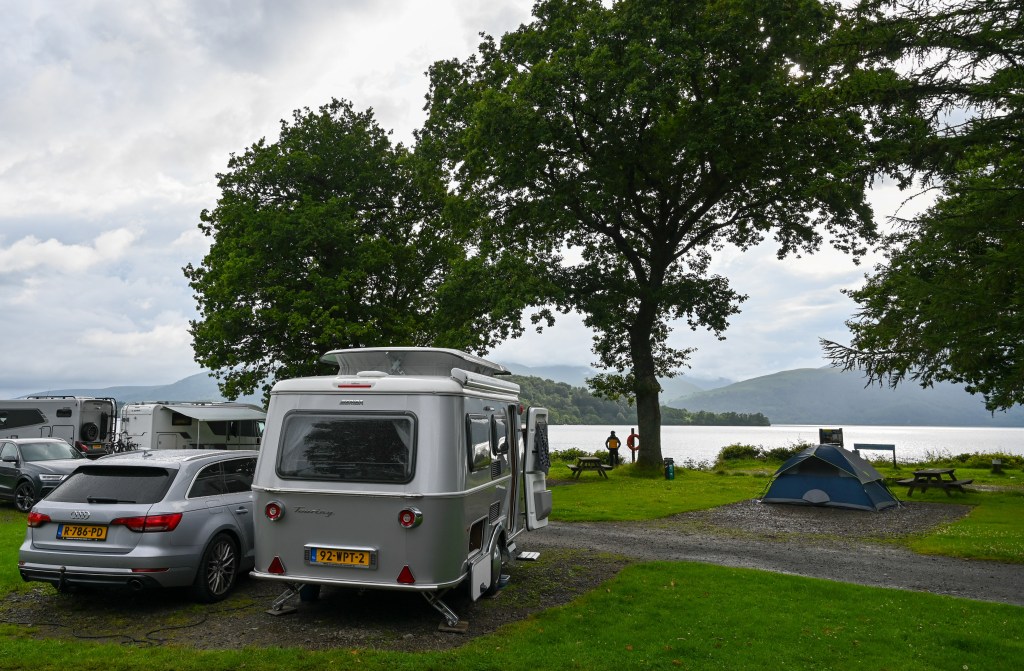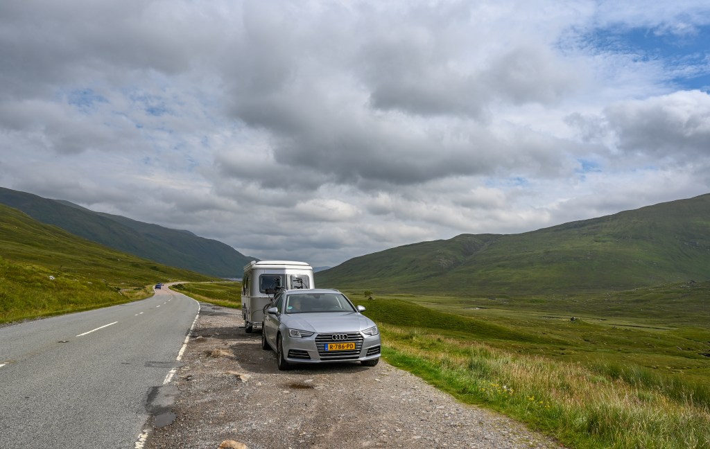 Glasgow is een stad met rondwegen van vier tot zes banen en afslagen de stad in. Vergelijkbaar met Amsterdam. Juist de afslag naar Lomond, die wij wilden hebben was afgesloten. Dus moeten we een stuk de stad doorkruisen. Veel stoplichten en afslagen en lelijke architectuur. Daarna nog een uur over een weg waarbij het asfalt net zo goed een achtbaan zou kunnen vormen, naar de camping aan Loch Lomond. Hoe dichter bij de camping, hoe mooier het landschap en hoe steiler de achtbaan. Omdat zich achter mij een file vormt probeer ik sneller te rijden waarbij de Eriba achter de auto aan danst. Eigenlijk rijd ik met 60 km per uur net iets te hard naar mijn gevoel. Terwijl ik 60 miles per uur (96 km/uur) mag rijden. Dat rijden de Schotten, die me durven in te halen ook. Af en toe schiet ik een parkeerplaats op om de file achter me op te lossen. De volgende dag neem ik mij voor me niet meer gek te laten maken en rijd net zo hard als ik zelf veilig vind. Zo kan ik ook nog iets van het prachtige landschap ervaren.