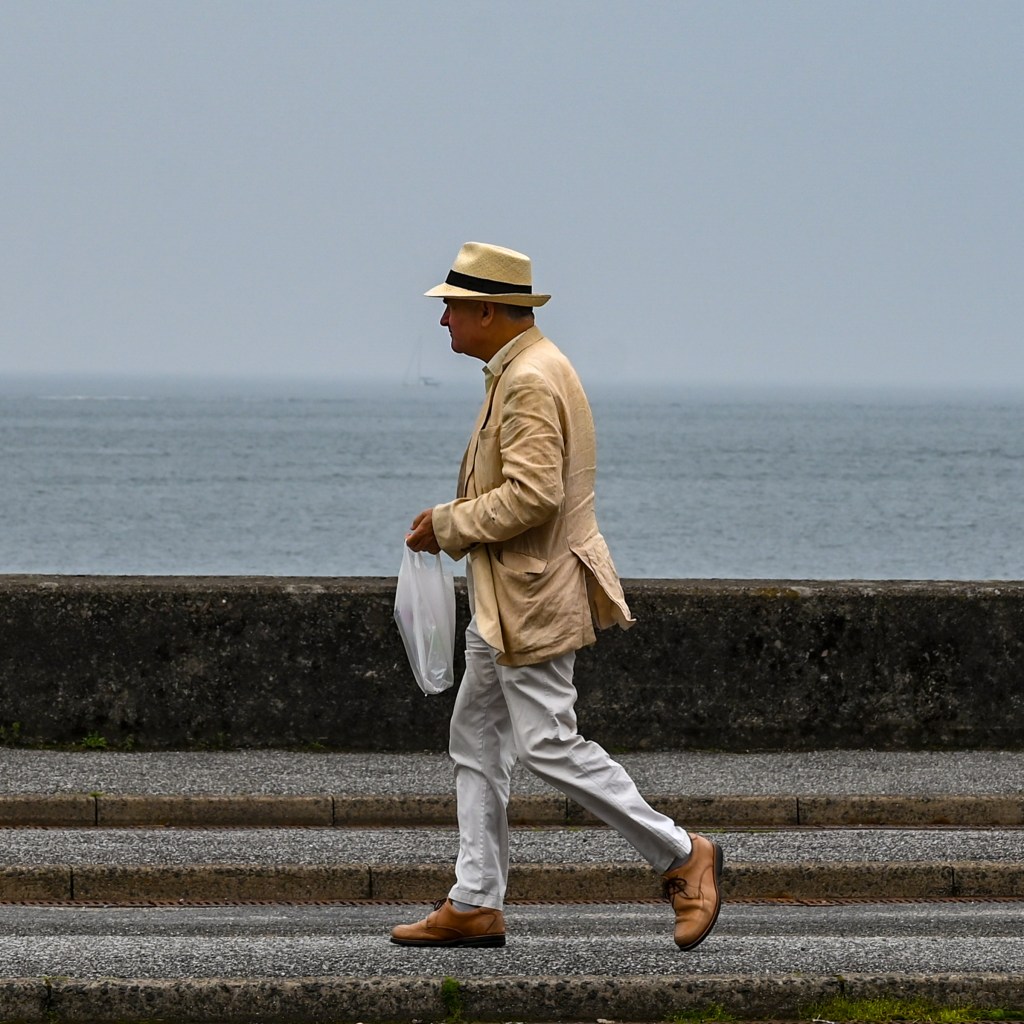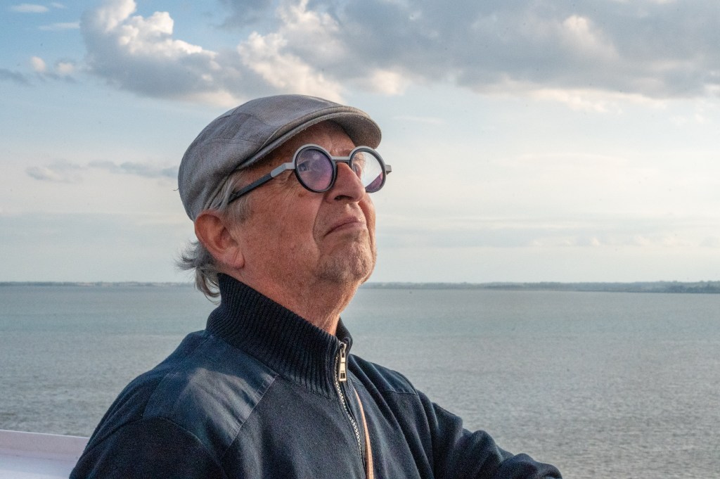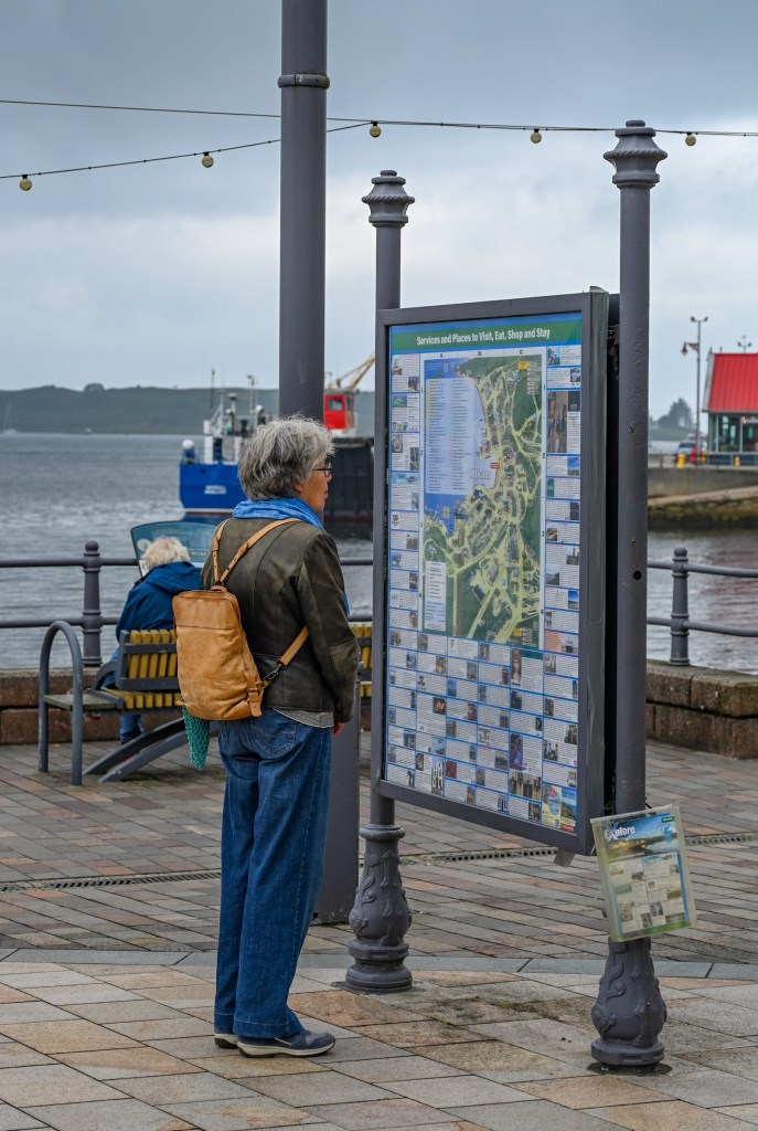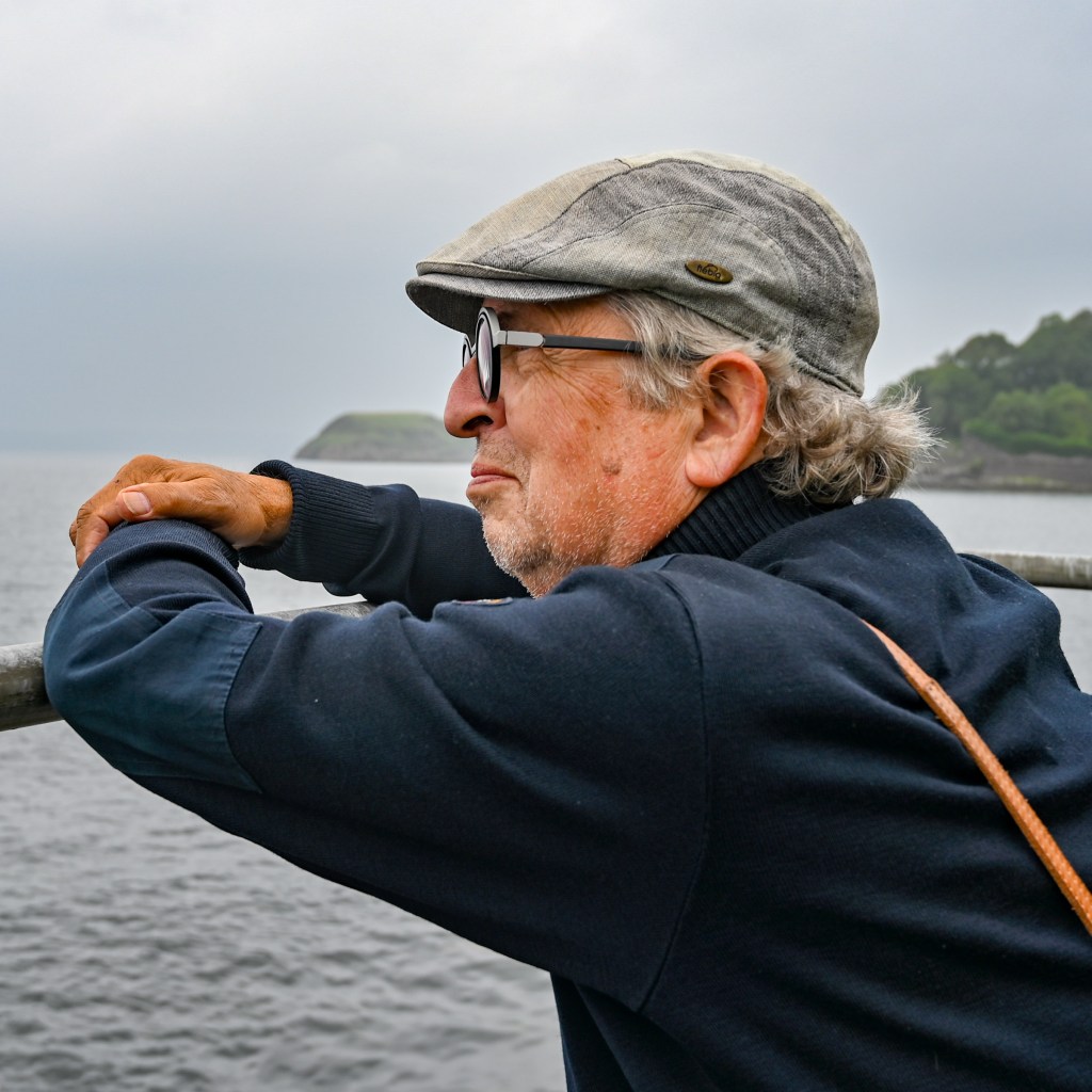We willen ook naar het eiland Mull aan de overkant, maar krijgen geen plek met de auto op het veer. Dan maar met de fiets gegaan en alleen de eerste heuvel op gefietst waarna mijn batterij al leeg begon te raken. Nog maar één streepje! In Schotland moet je sowieso niet fietsen ervaren we. Veel te gevaarlijk en te grote afstanden. Dan maar met een kleine bus met een onverstaanbare buschauffeur die ons over smalle dichtbegroeide, kronkelige weggetjes naar het dichtstbijzijnde kasteel ontvoert. De tentoonstelling in het kasteel laat de geschiedenis zien waarin de MacClean-clan een belangrijke bijdrage in had. Eén portret wat er hangt heeft veel weg van Prins Charles. We lopen rond het kasteel waarbij het uitzicht adembenemend is. Bij terugkomst bij het veer loopt er een soort Monsieur Hulot over de kade in een licht pak met lichte hoed. Ik kan het niet laten hem te fotograferen.