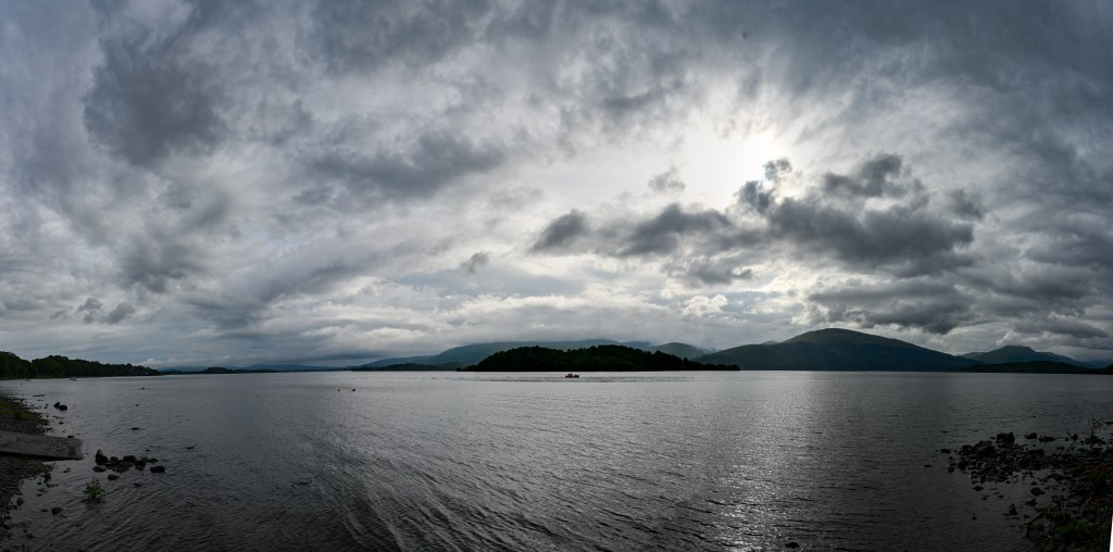 We staan direct aan het grote meer. Het weer is wisselvallig zodat er prachtige Schotse luchten ontstaan. We hebben als doel zo veel mogelijk de scheiding tussen land en water te volgen en gaan Clockwise Schotland rond. Natuurlijk fotografeer ik de prachtige gezichten op het water in een panorama. Zodat jullie niets missen. De eerste hierboven is Loch Lomond, een binnenmeer.