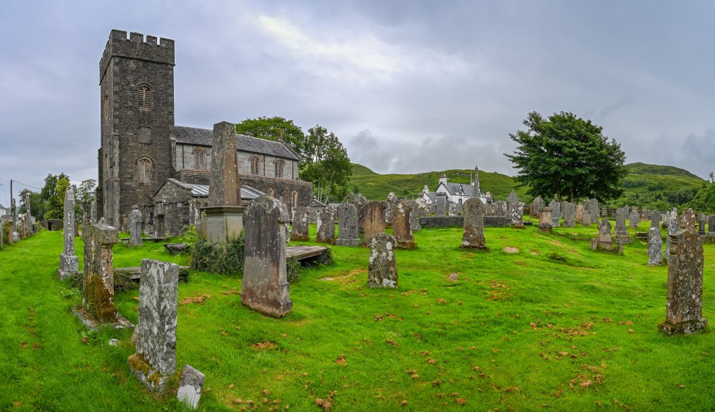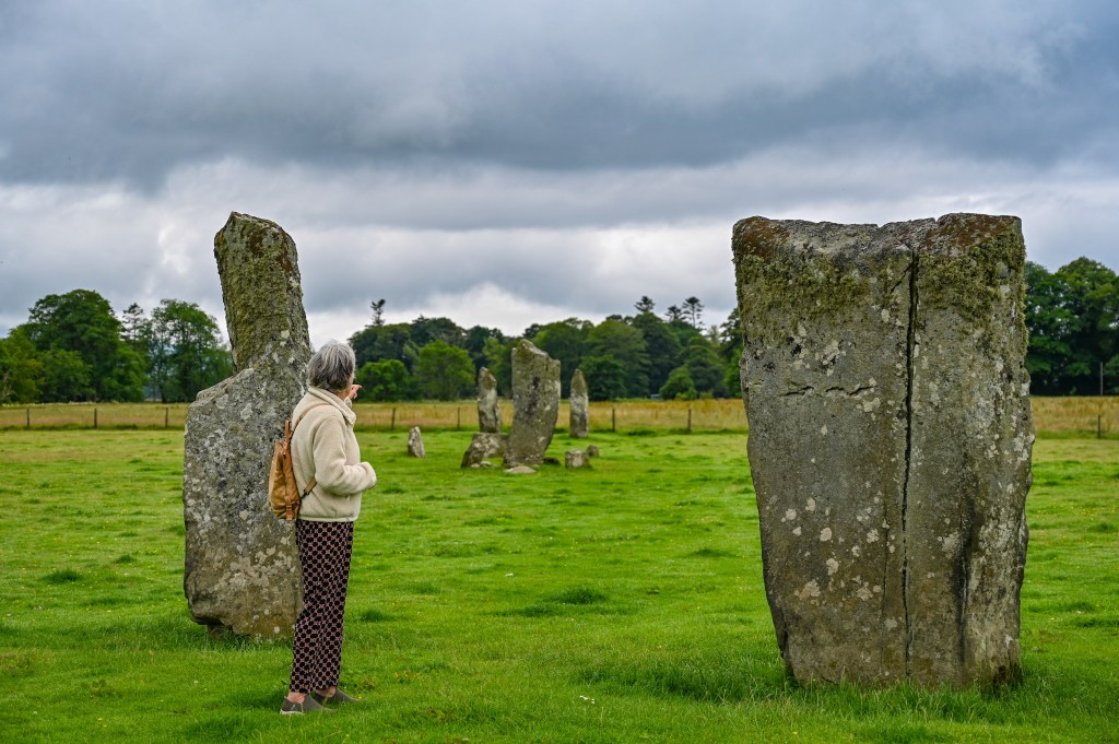 Op onze route langs de kust vandaag, verder naar het westen, stuiten we op een archeologisch monument. Vijf stenen die rechtop in het gras staan blijken al een vroege poging (5000 jaar geleden) de hemellichamen zon en maan te duiden. Nog iets verder ligt een prachtig Schots kerkje met oude graven er omheen.