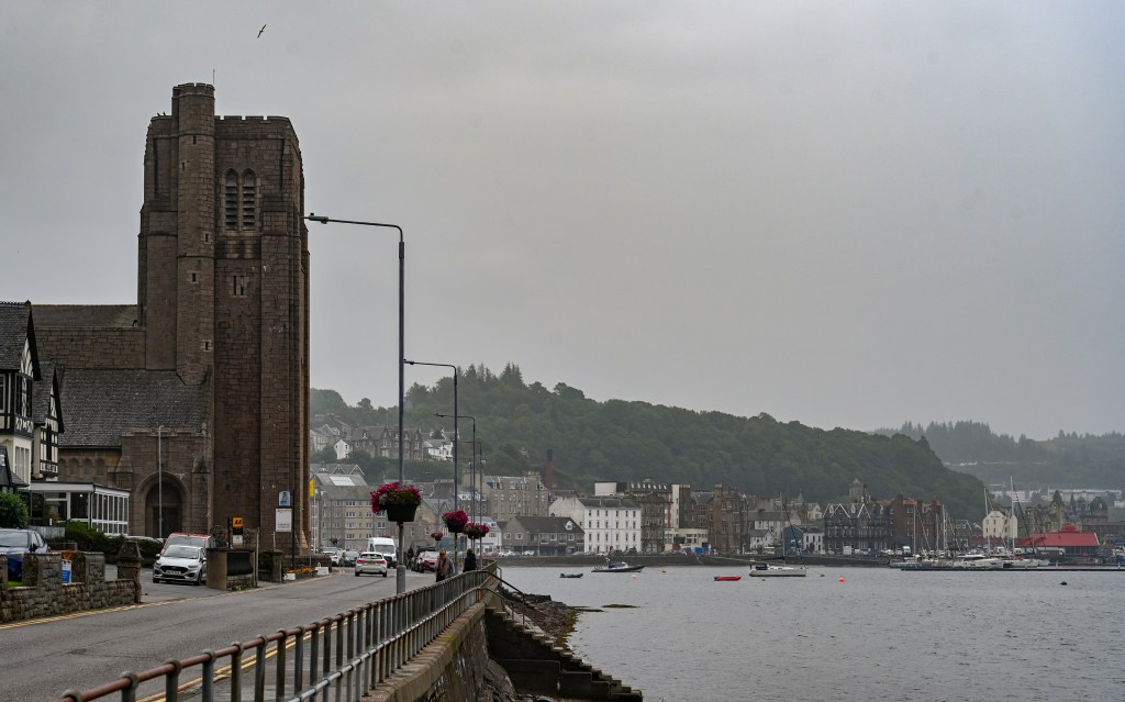 Oban met stoere gebouwen aan het water en meeuwen op de kade.