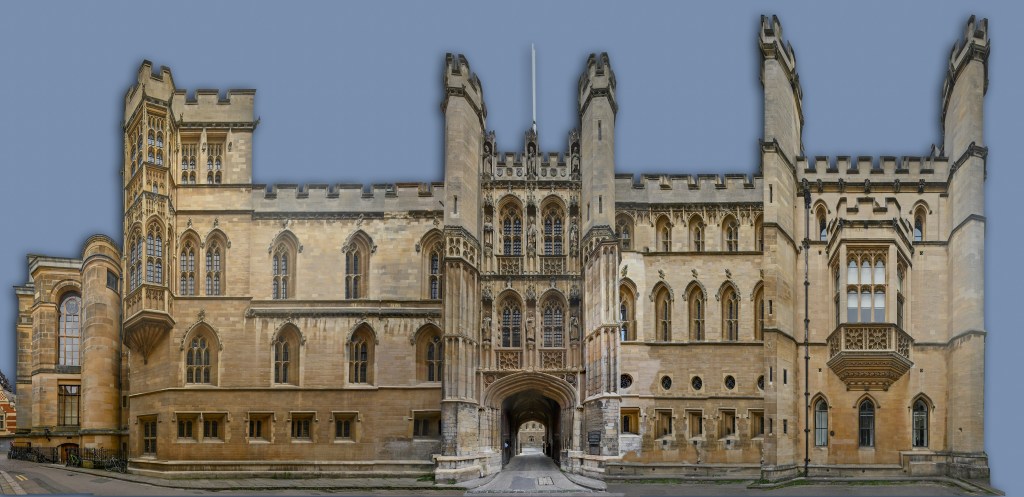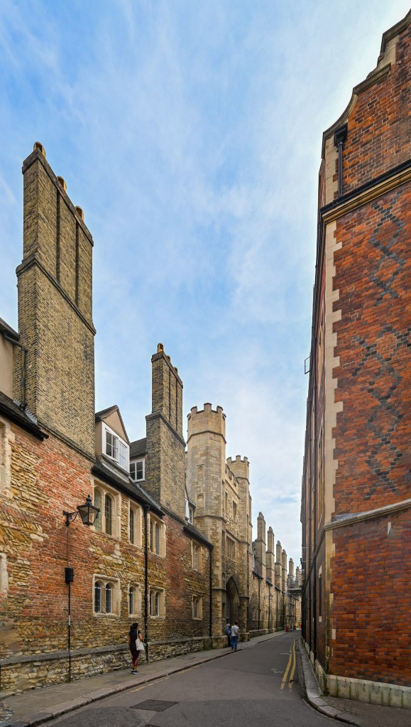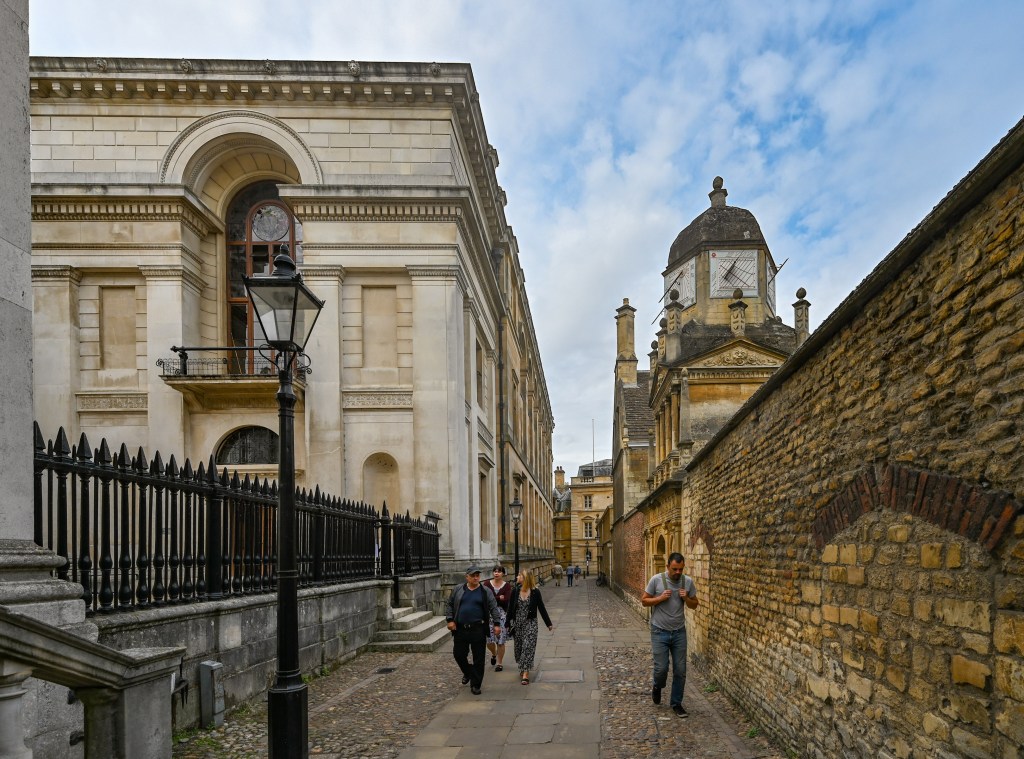 Als we door Cambridge lopen dan blijkt dat de universiteiten helemaal met de stad vergroeid zijn. Ook valt op dat veel gebouwen grote binnenruimten hebben. Het lijkt wel of de stad talloze universiteiten huisvest. Maar het is er maar een. Elke faculteit lijkt zijn eigen gebouw met eigen uitstraling te hebben. Als je tussen de gebouwen door loopt dan komt de monumentaliteit van de gebouwen en de stad nog beter over.