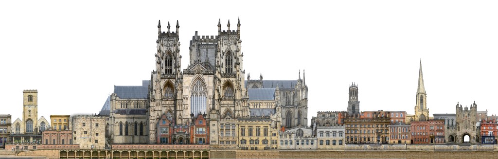 Ik kan het niet laten een stadsgezicht van York te maken, zo’n bijzondere stad. De kathedraal steekt hoog boven de omringende bebouwing uit. Dat is goed te zien op bijgaand stadsgezicht. De kleine kerken vallen daarbij in het niet.