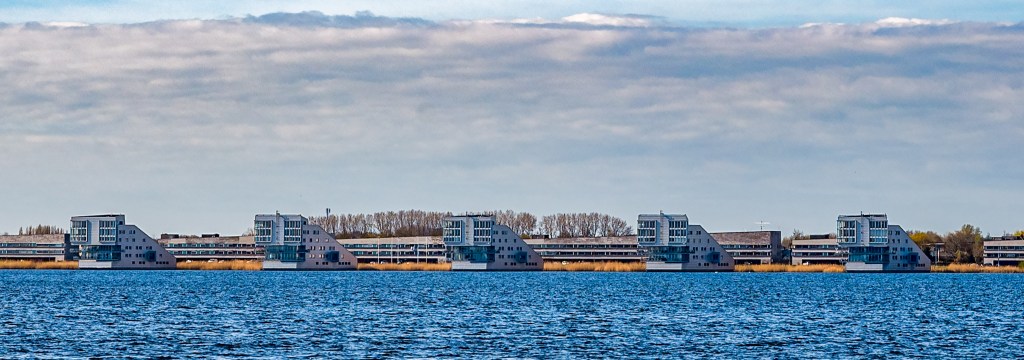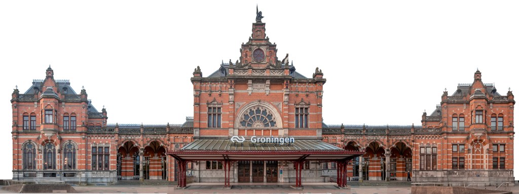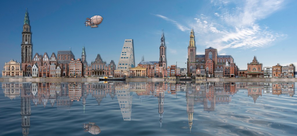 Omdat het mooi zonnig weer was heb ik van de gelegenheid gebruik gemaakt om de stad meerdere dagen te doorkruisen. Daarbij heb ik op verschillende tijdstippen van de dag foto’s van de bijzondere en minder bijzondere gebouwen van de stad gemaakt, om daarna in de afgelopen twee weken die foto’s samen te stellen tot een stadsgezicht. Een heel klusje. Vooral dit stadsgezicht van Groningen. Het is toch een grotere stad dan ik in m’n hoofd had.