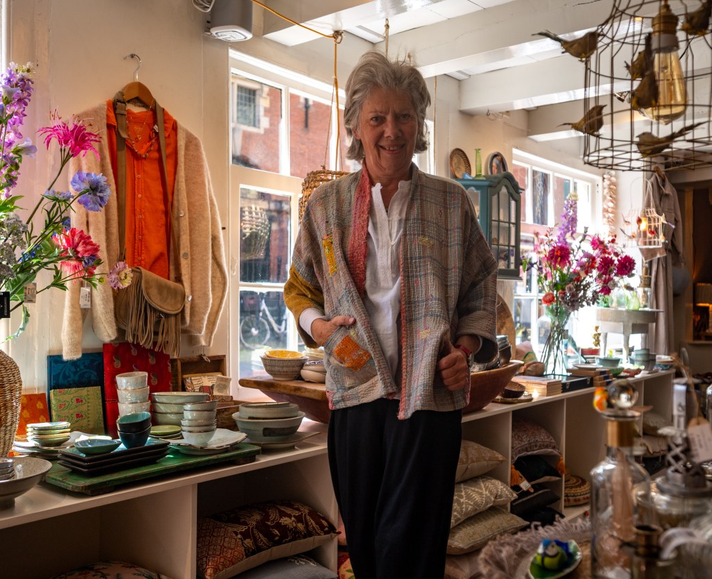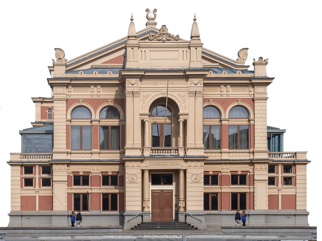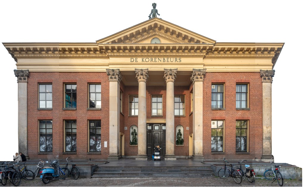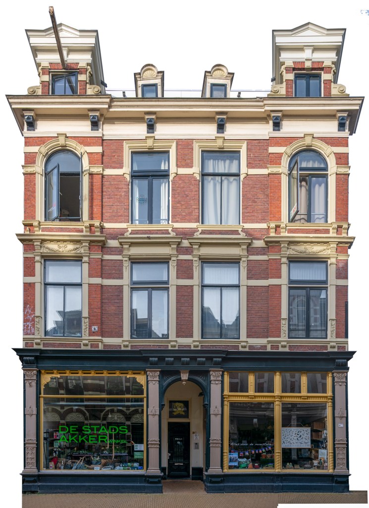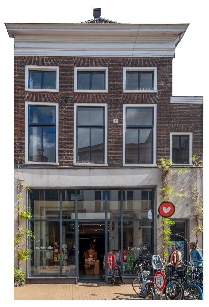 Ik had de intentie veel meer moderne gebouwen in het stadsgezicht op te nemen, waaronder het Groninger Museum. Die hebben het echter niet gered omdat het stadsgezicht al helemaal vol liep door de veelheid aan beelden die ik op mijn zwerftocht door de stad verzamelde. Bovendien vind ik het Groninger museum een kitscherig Fremdkörper in de stad, waardoor het detoneert met alle oudere gebouwen met een klassieke architectuur. Samen met Arnold heb ik ook nog een paar hoge gebouwen rond de stad gefotografeerd, waaronder het gebouw van de Gasunie, maar ook die hebben het ook niet gehaald. Wellicht dat ik die nog in een andere versie verwerk. Wel heb ik het Forum in het stadsgezicht opgenomen. Het toch wel grote gebouw gedraagt zich opvallend rustig door haar kleur en terugvallende gevels. En natuurlijk ook de leuke winkel Hartendief van onze nicht Liesbeth. Ze runt een prachtige winkel in kinderkleding in de Oosterstraat, vlak bij het Forum. Een bezoek waard!