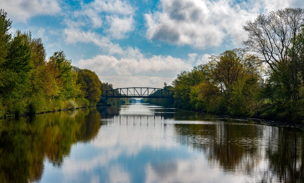 Onderweg op de Eems genieten we van het frisse ontluikende groen, vooral aan de bomen en van het vroege ochtendlicht op het water van het Küstenkanaal. We hebben vaker het Küstenkanaal gevaren. Al in 2005 met onze ONJ 10.20 Post 3, op weg naar Denemarken. Dit keer genieten we meer want het is heel rustig op het kanaal, varen heel rustig met een gangetje van maar 10 km/uur, nemen de tijd.