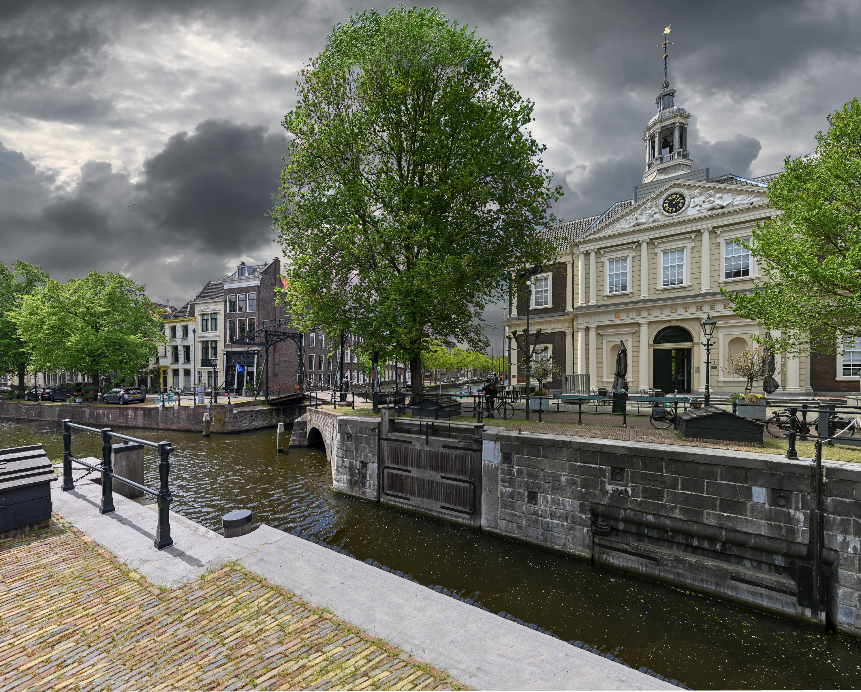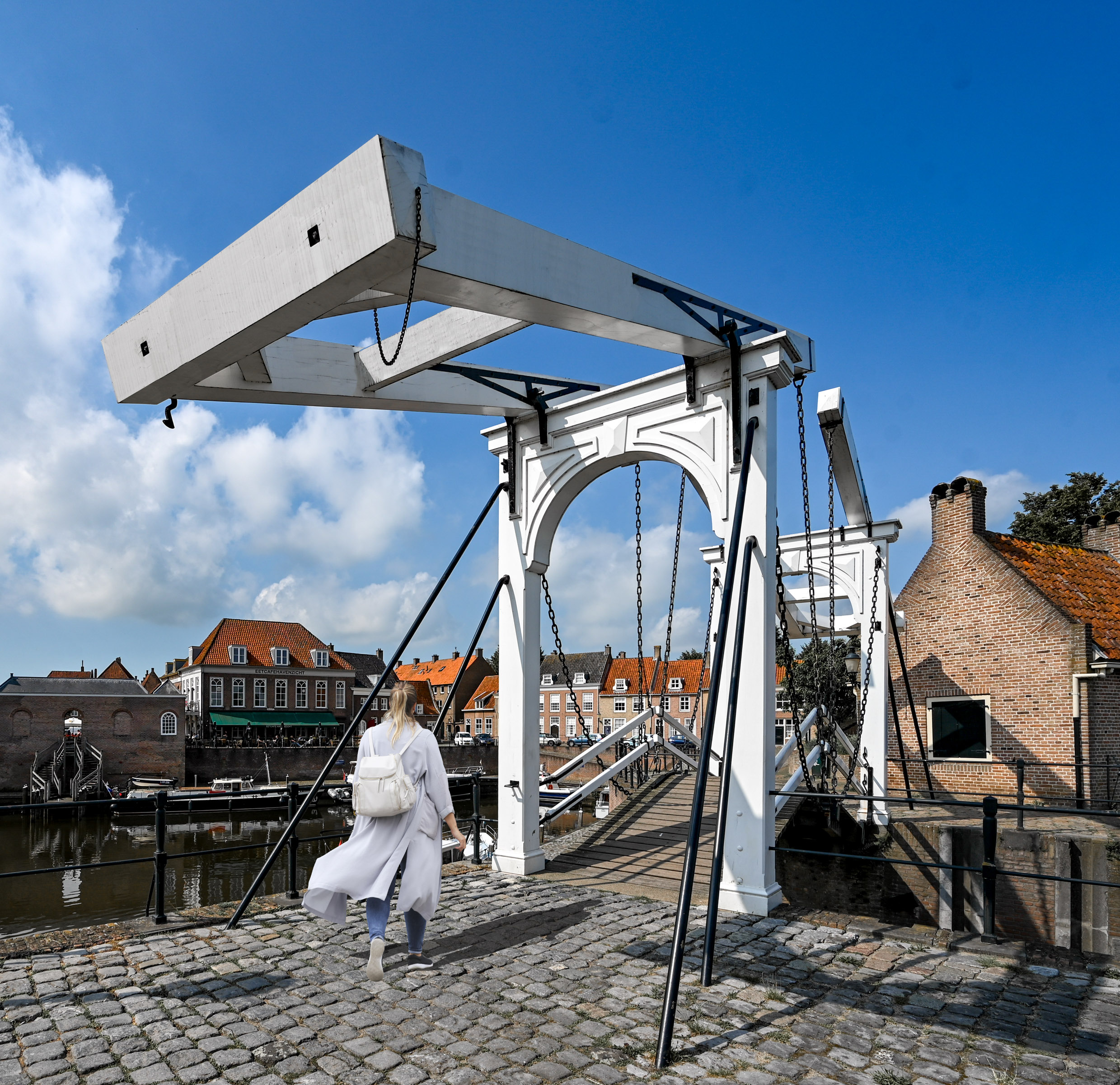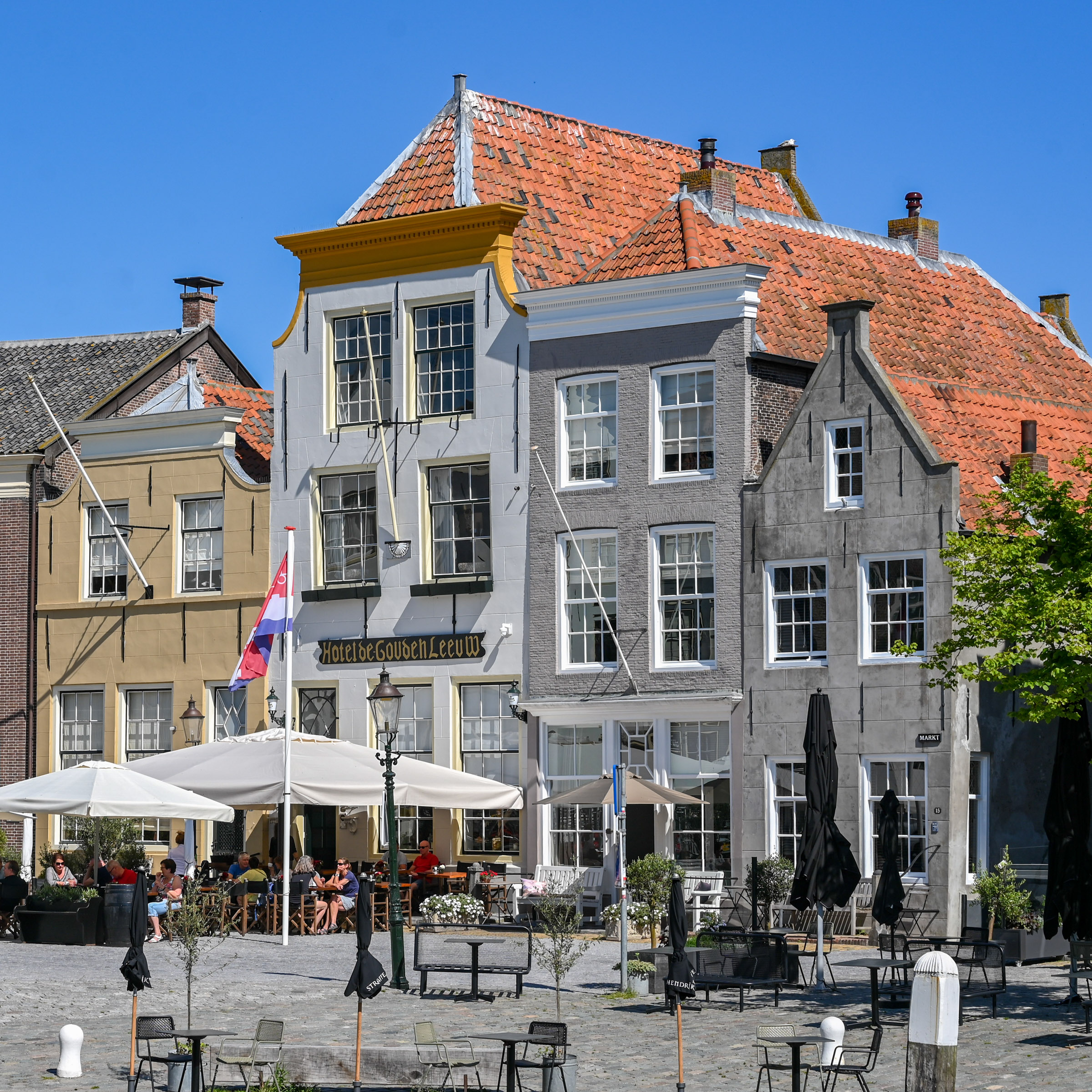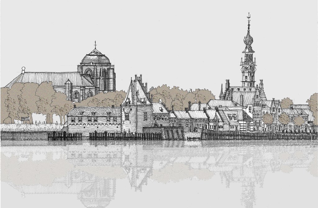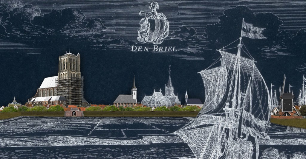 Stadsgezicht op Brielle met een oude kaart als onderlegger.