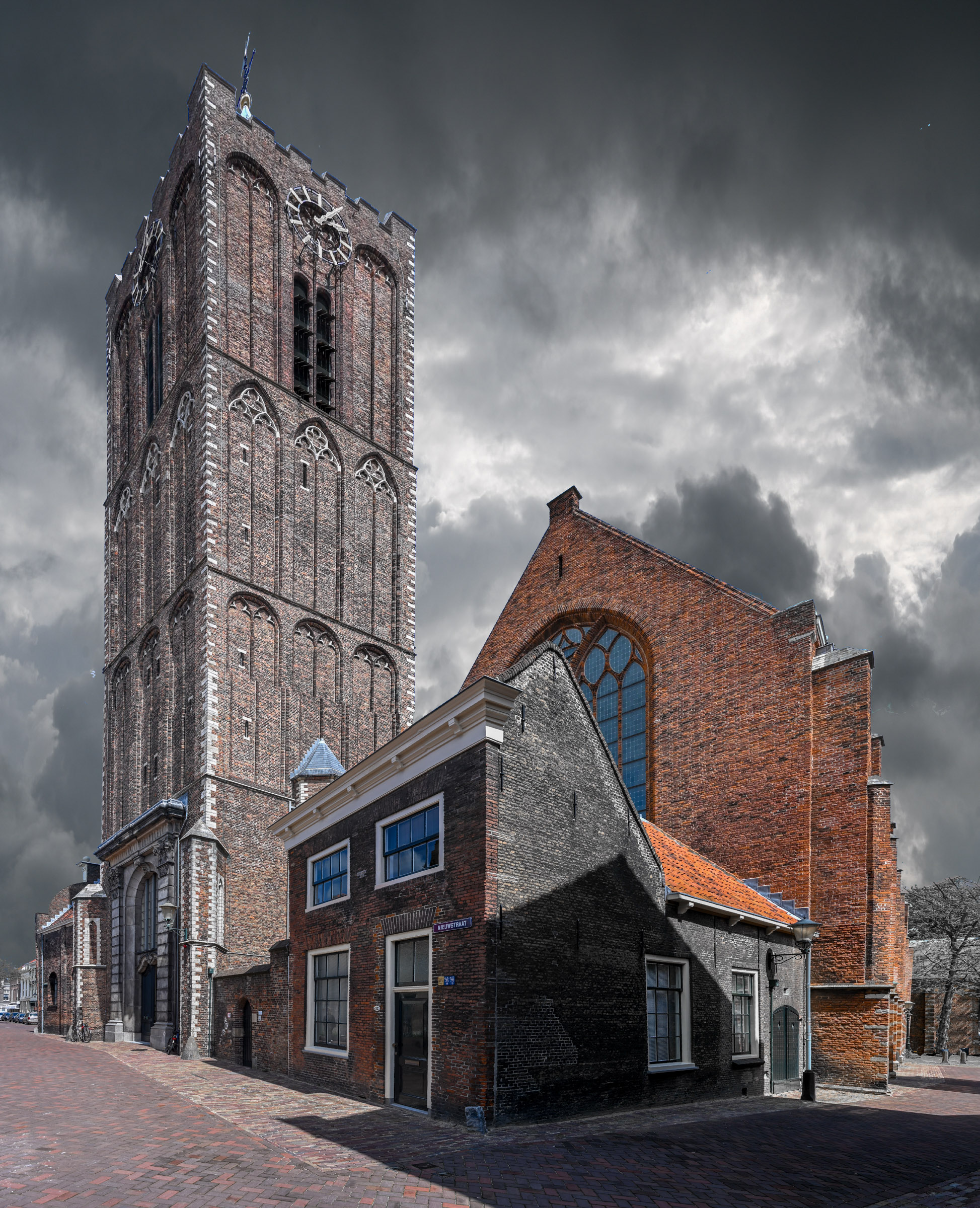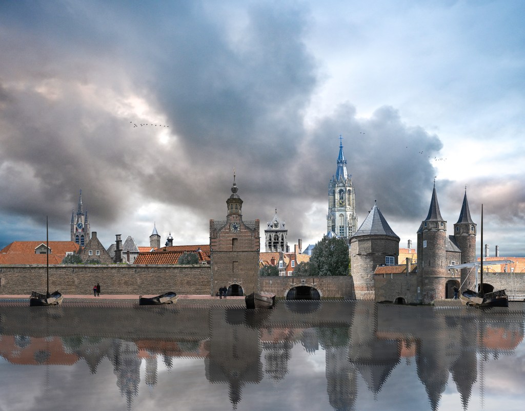 Tussen de buien door maak ik foto’s van Delft. Zo kan ik, als het buiten guur en koud is op de boot de foto’s samenstellen tot een stadsgezicht. En wat is er leuker dan het ‘Gezicht op Delft’ van Johannes Vermeer proberen na te bouwen. Heel leerzaam. Veel van de poorten en oude gebouwen uit de 17e eeuw zijn echter verdwenen. Maar, door goed te zoeken vind ik toch nog monumenten die er voor in de plaats kunnen staan. En natuurlijk wordt dit met foto’s samengestelde stadsgezicht niet hetzelfde als het met vlotte kwast geschilderde exemplaar van Vermeer. Het blijft een interpretatie. Zo heb ik rechts in mijn stadsgezicht de Oosterpoort gebruikt, waar Vermeer de Schiedamse poort schilderde en heb ik veel meer onderdelen op een andere plek in de stad gevonden. Maar, de toren, het stralende middelpunt staat er gelukkig nog steeds. Het mooiste is om het licht dat Vermeer probeerde te vangen, na te maken. Een hel verlichte toren en rode daken op de achtergrond, suggereren dat de stad daar door de zon beschenen wordt.
