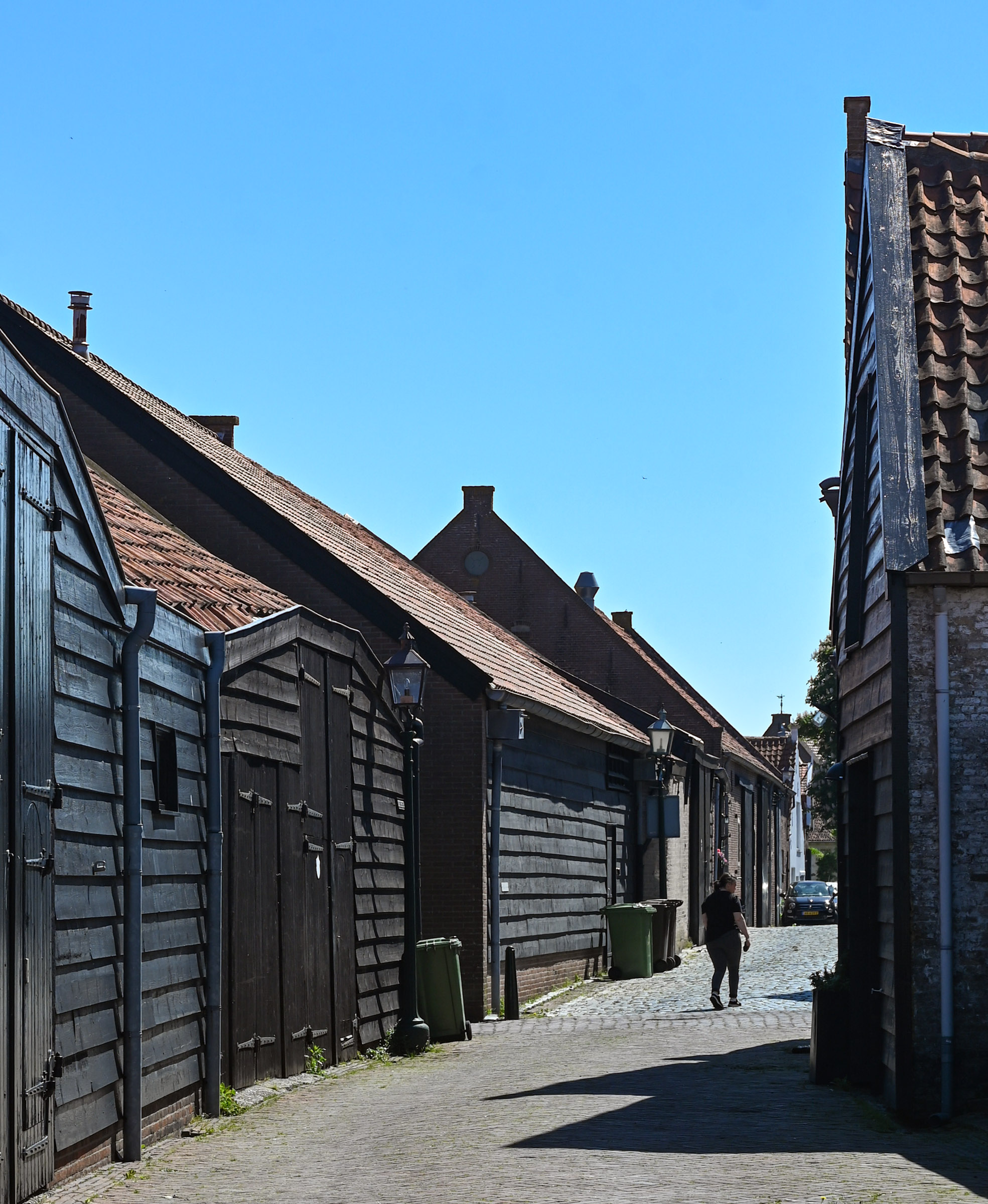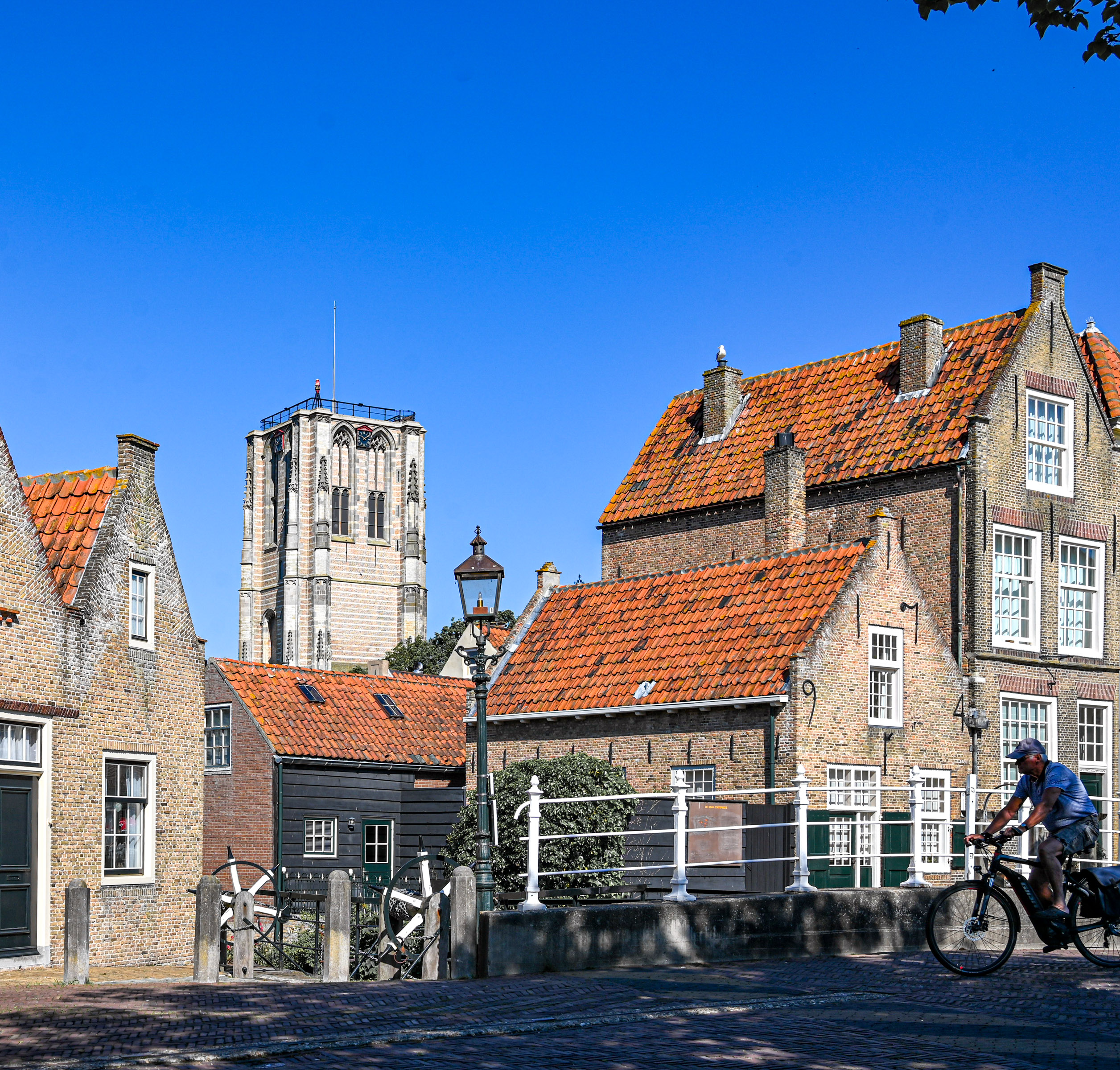 Ik had bij aankomst in Goedereede het voorrecht om zo’n beetje als eerste na het Coranatijdperk de toren te mogen beklimmen. Er zaten beneden twee mensen even uit te puffen die de toren aan het schoon maken waren. Het schoonmaken betekent ook het stofzuigen van de 275 traptreden van de toren. Omdat ze toch aan het werk waren mocht ik, samen met nog iemand naar boven. ’n Hele klim, maar het uitzicht was de moeite waard. Er is ook niets mooier voor een stedenbouwer dan de verkavelingsstructuur van een stad van boven te bekijken. En Goedereede is extra de moeite waard vanwege haar prachtige patroon van daken en schuren die langs smalle straten in het stadje staan. Het middeleeuwse stratenpatroon is praktisch nog volledig in takt. Goedereede heeft nog een oude “schurenstraat” waar vroeger de boeren hun werkplaatsen en opslag hadden. Van de oorspronkelijke stads-wallen is niet veel meer over. En het is natuurlijk jammer dat de stad nu midden op het eiland Goeree ligt terwijl het vroeger een uitgang naar zee had en van de visserij leefde.