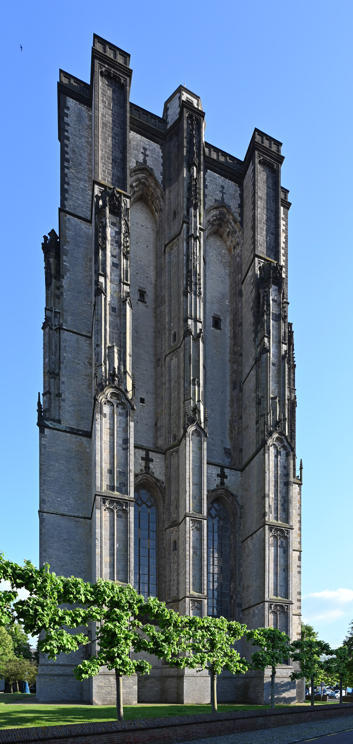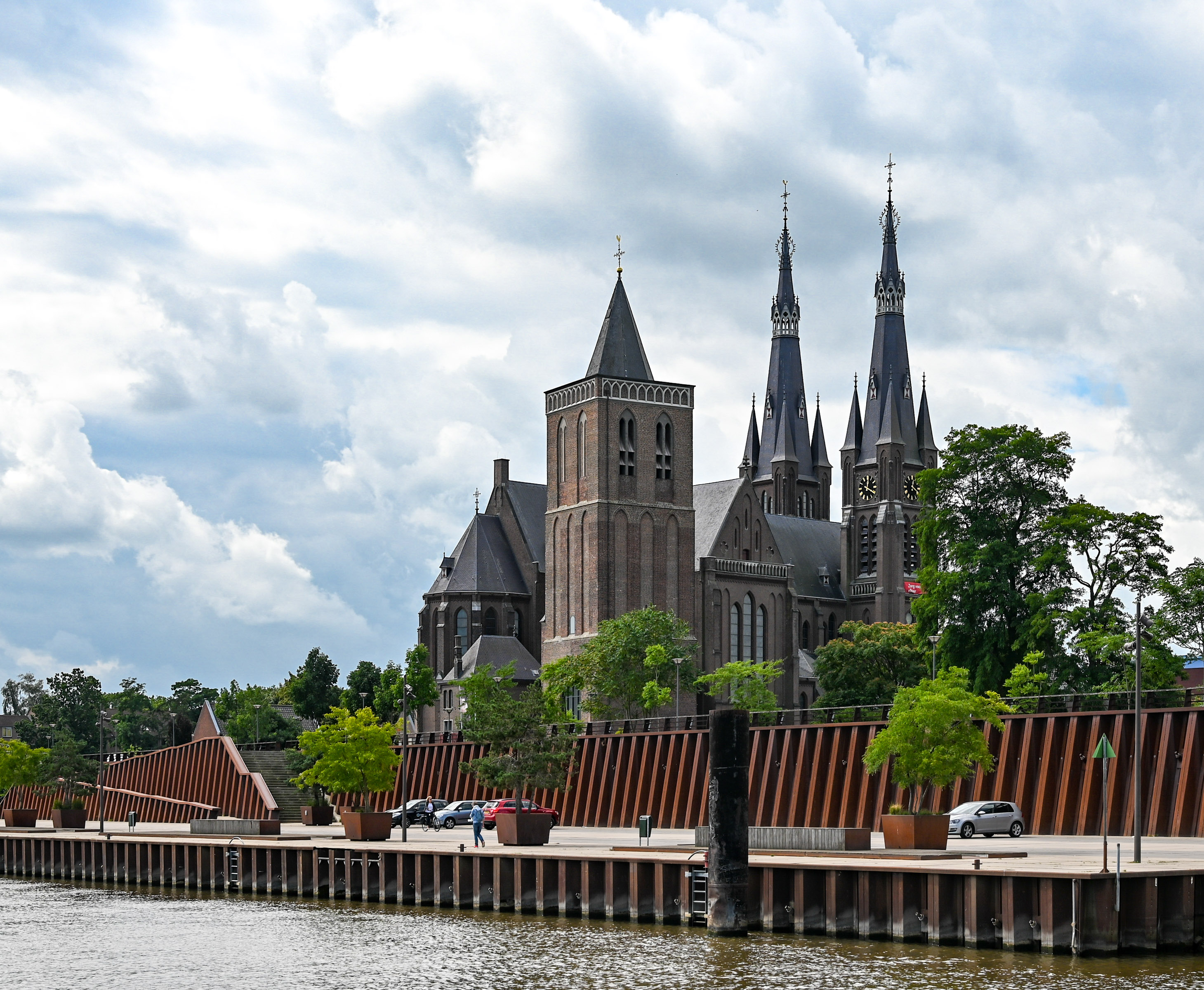 Vanuit de kuip: De door Cuijpers (die van het Rijksmuseum) gerestaureerde O.L.V. Munsterkerk in Roermond. Rechts de latere bebouwing met poort in mergelsteen, rond de Abdijhof, ontworpen door jongere familieleden van Cuijpers senior.