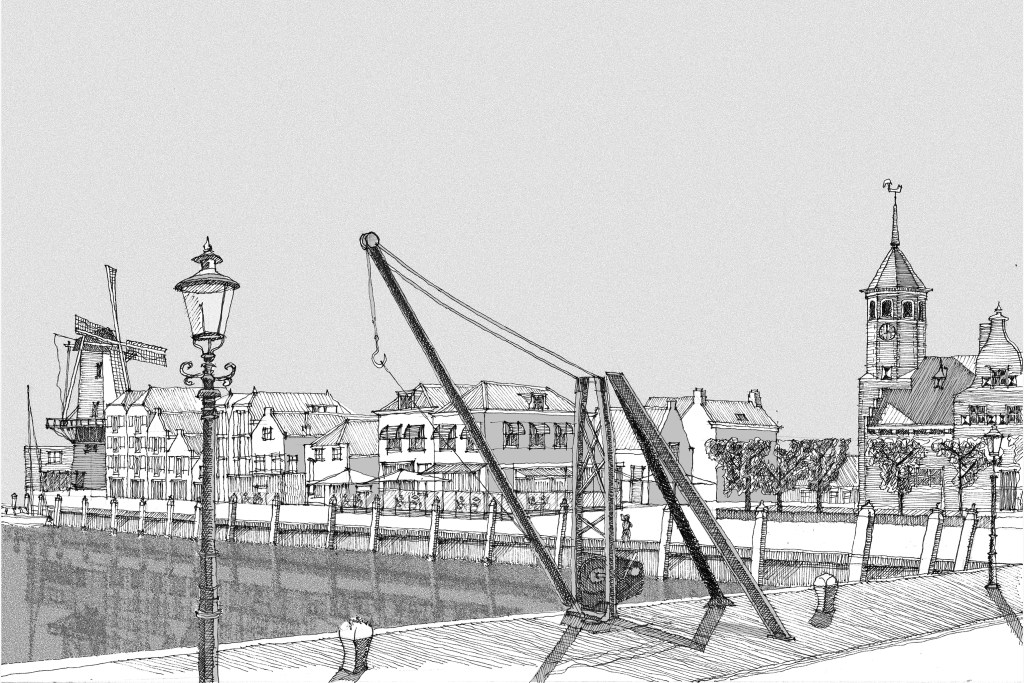 Ik teken het havengezicht van Willemstad met een oude hijsinstallatie op de voorgrond.