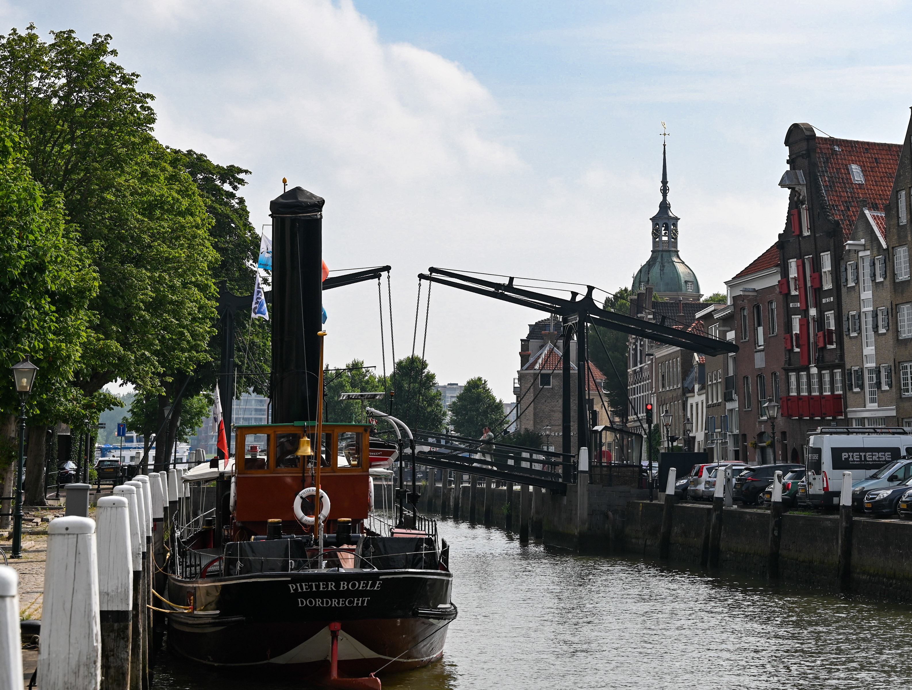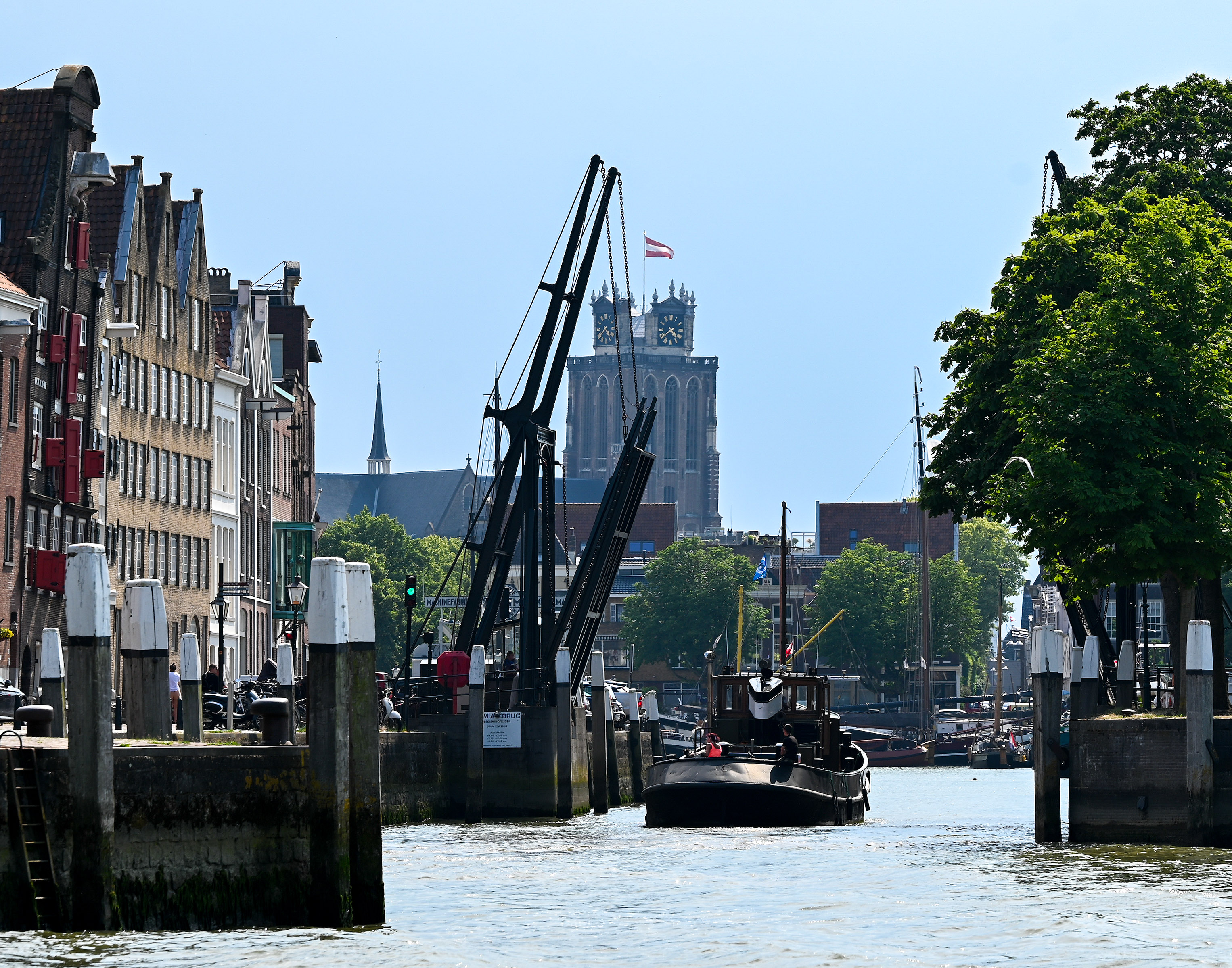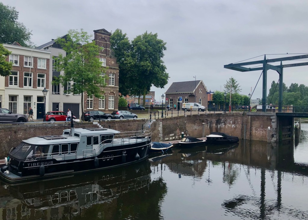 Ons rondje Zeeland zit er op. Na een onrustige nacht aan een steiger bij de Volkeraksluis zijn we vanochtend vroeg, in de druilerige regen, via het Hollands Diep en de Dordtsche Kil naar Dordrecht gevlucht. De noordelijke wind stond vannacht recht op het drijvende steiger. Toen Ria vanochtend even boven ging kijken, hing de zware boot voor ons, half op twee springen aan het steiger. Ik heb de mensen nog proberen te wekken maar ze gaven geen sjoege. We vertrouwden het niet en zijn voor dag en dauw vertrokken. Stel je voor dat die boot los raakt en met de wind tegen Tiberius aan klapt. De tocht over de Dordtsche Kil was onrustig met stroom tegen wind en de zware tankers die ons passeerden. Door de zuiging van de schepen stond er af en toe een golfslag op de rivier waardoor de kortere boot voor ons zich gedroeg als een duikelaartje. Hier in de haven van de Koninklijke Dordrechtse Roei- en Zeilvereniging liggen we goed. We blijven hier minimaal een week. We bezoeken donderdag de voorstelling Beefteefjes van Servaes Nelissen in Kunstmin hier in de stad. En natuurlijk is er nog veel meer te zien in deze prachtige middeleeuwse stad.