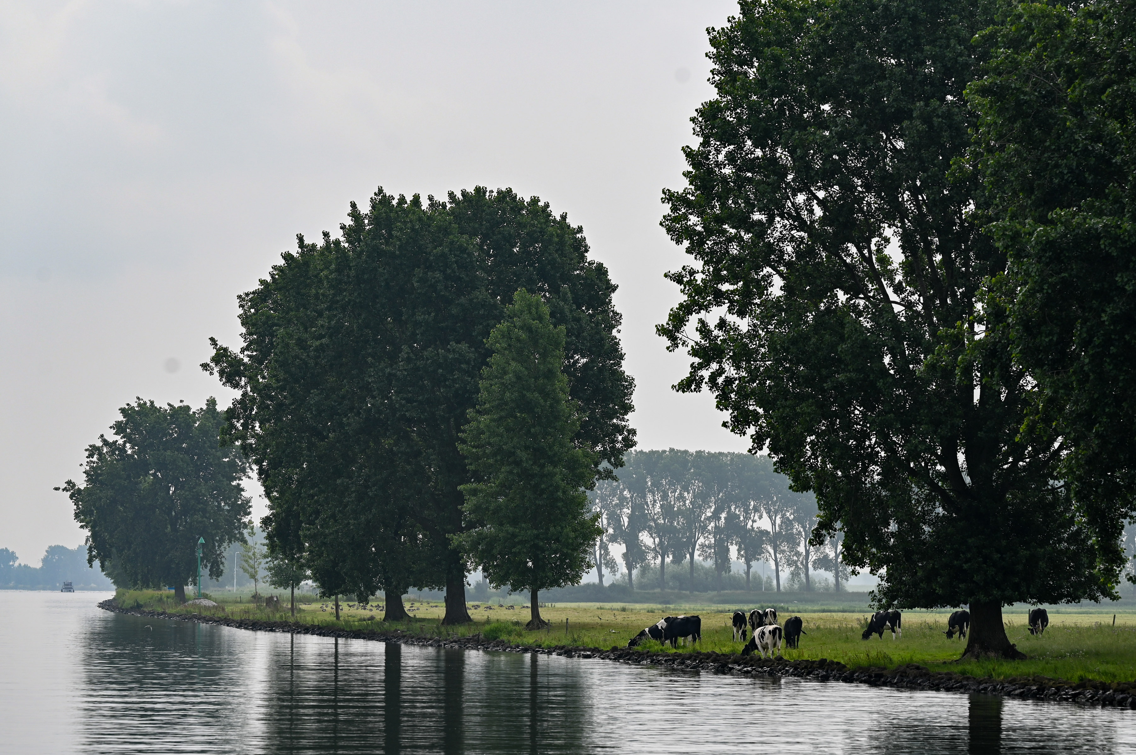 Op naar Heusden. De Maas is nu gelukkig nog rustig. De rivier is prachtig. Langzaam meandert de Maas door het landschap, een Amerikaanse windmolen en koeien langs de kant. Grote bomen begeleiden als piketpalen de loop van de rivier.