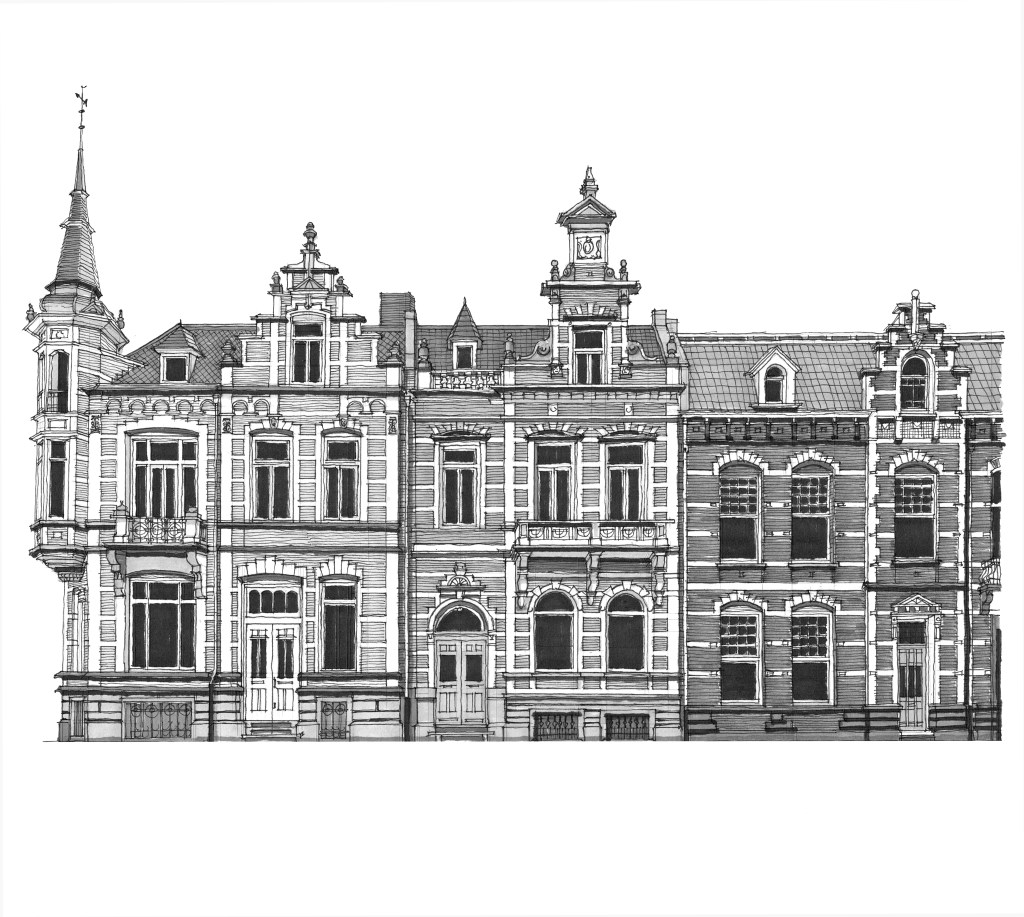 Vanuit de Kuip getekend: Prachtige, zeer gedetailleerde Neo-renaissancegevels aan de Stationsweg in ’s Hertogenbosch