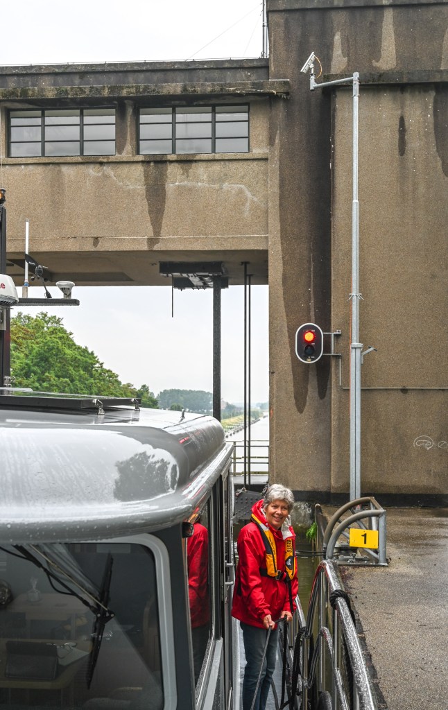 Ria houdt Tiberius stevig vast in een van de sluizen in het Julianakanaal. Achter zie je het hoogteverschil, 12,5 meter, dat we al overbrugd hebben.