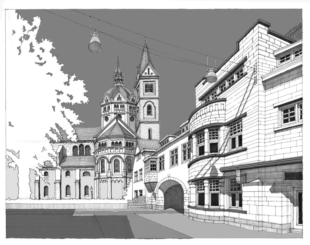 Ondertussen maak ik vroeg in de ochtend foto’s van de stad, op zoek naar een lokatie waar ik weer een schets kan maken. Ik maak veel foto’s rond de kerken aan het Vrijthof. Alhoewel het een mooi plaatje kan worden ….. maar om nu weer kerken te gaan tekenen stuit mij tegen de borst. Misschien later nog eens.