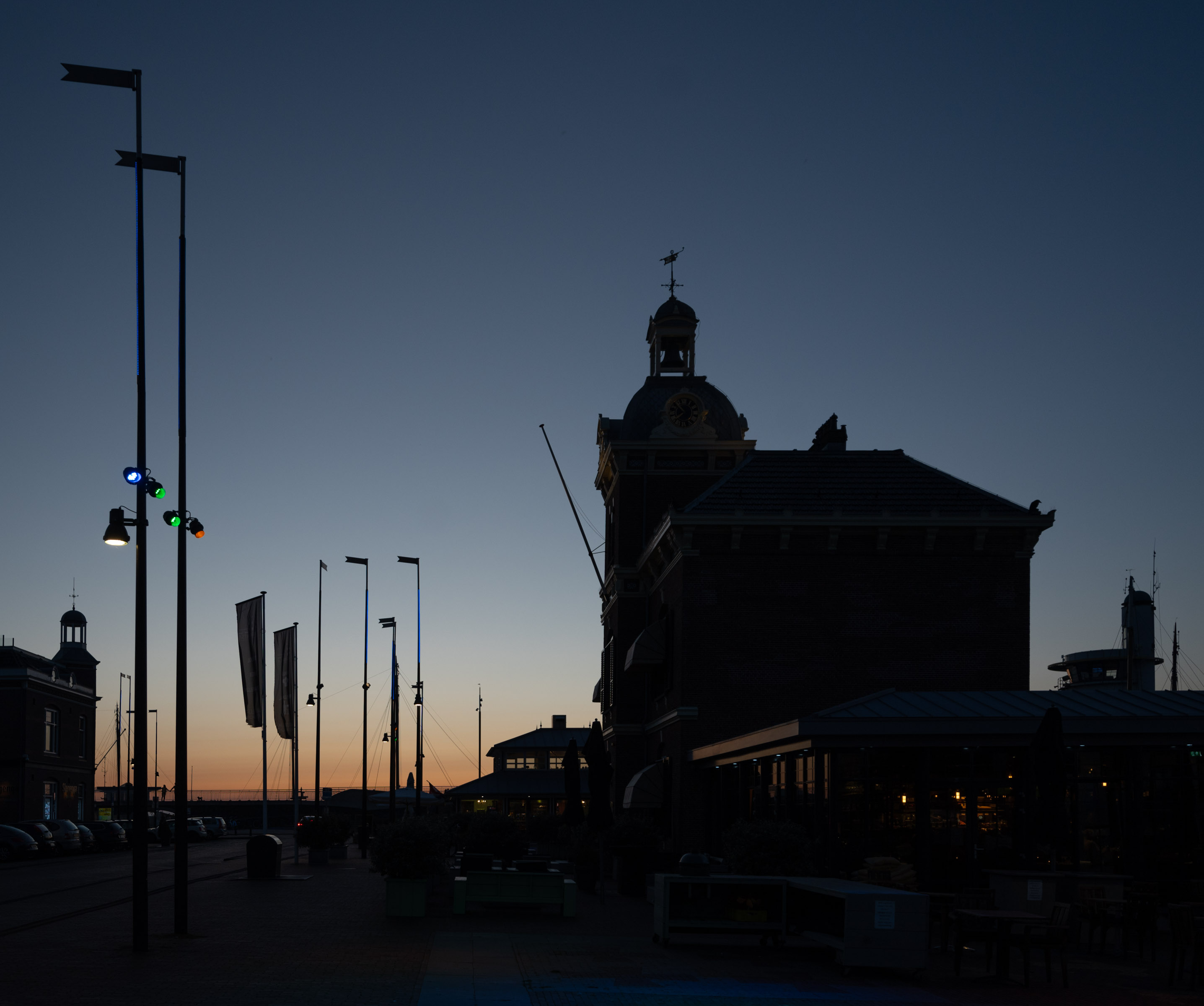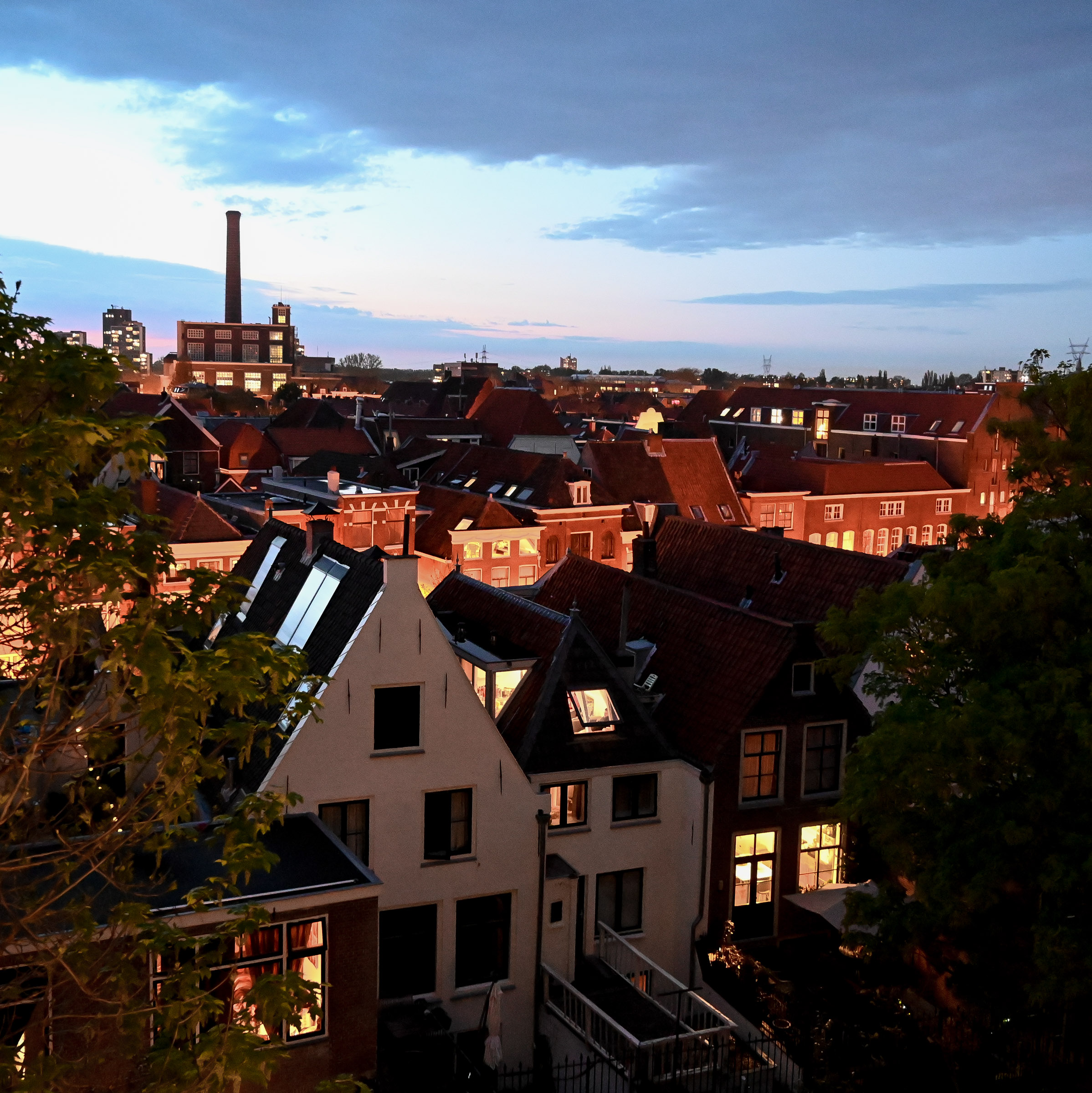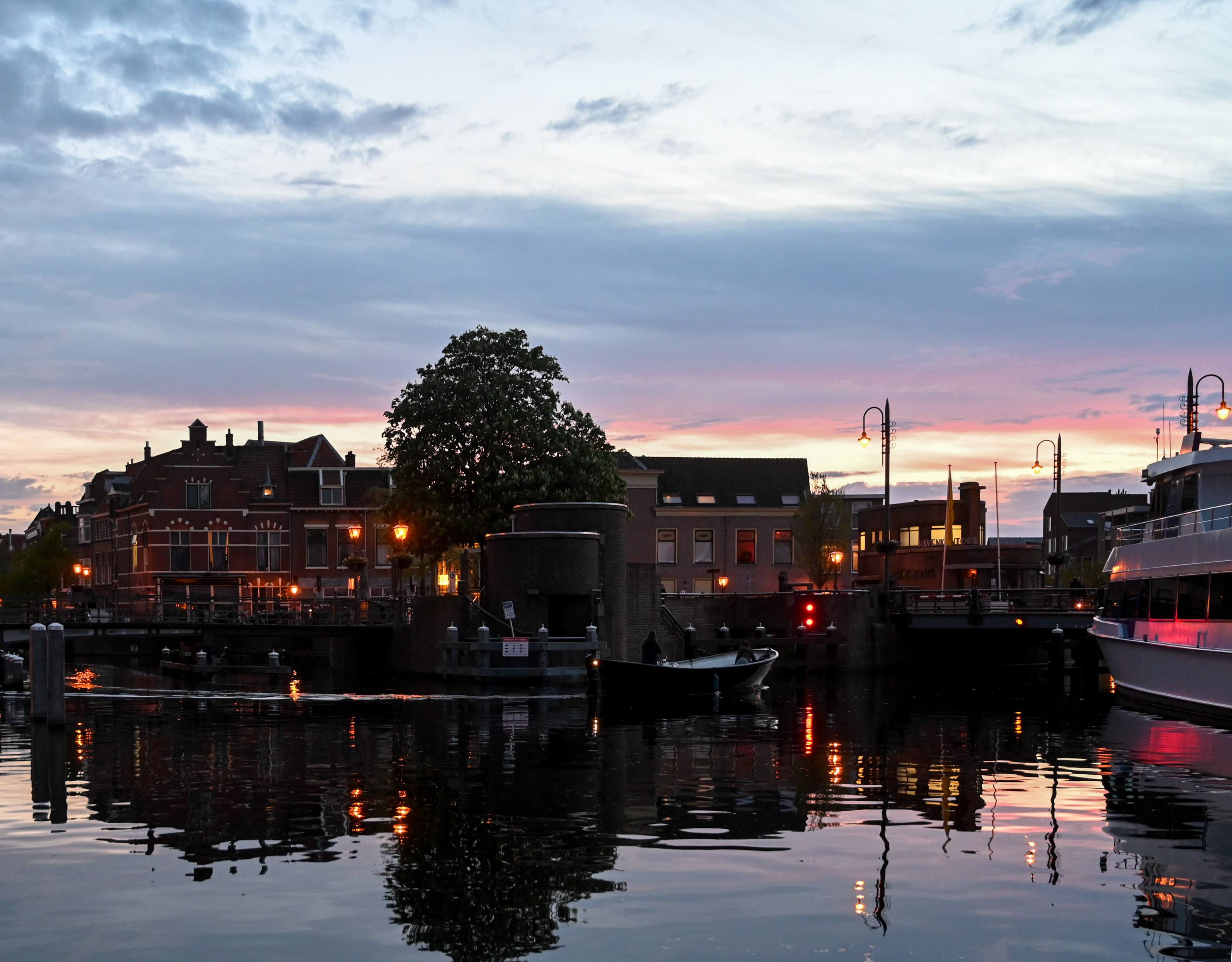 En natuurlijk leuk om Leiden weer opnieuw te ontdekken. Ik maak een tekening van het havenkantoor en avond-foto’s van de stad. De voorlaatste avond in Leiden nodigen we Frank en Ineke uit, die vlak bij langs de Zoeterwoudsesingel wonen. Ook met hen hebben we, onder het genot van een drankje, heel wat bij te praten.