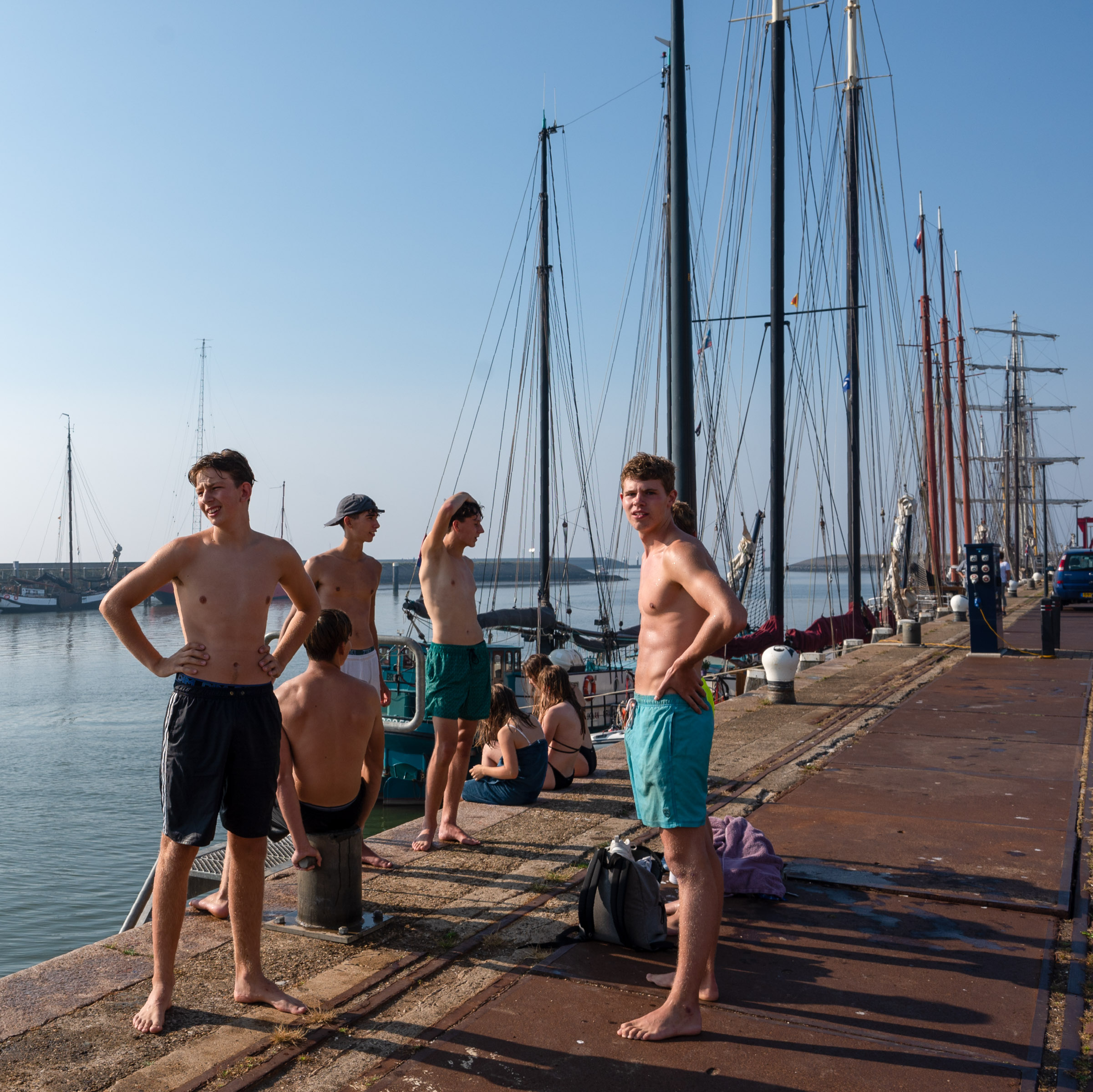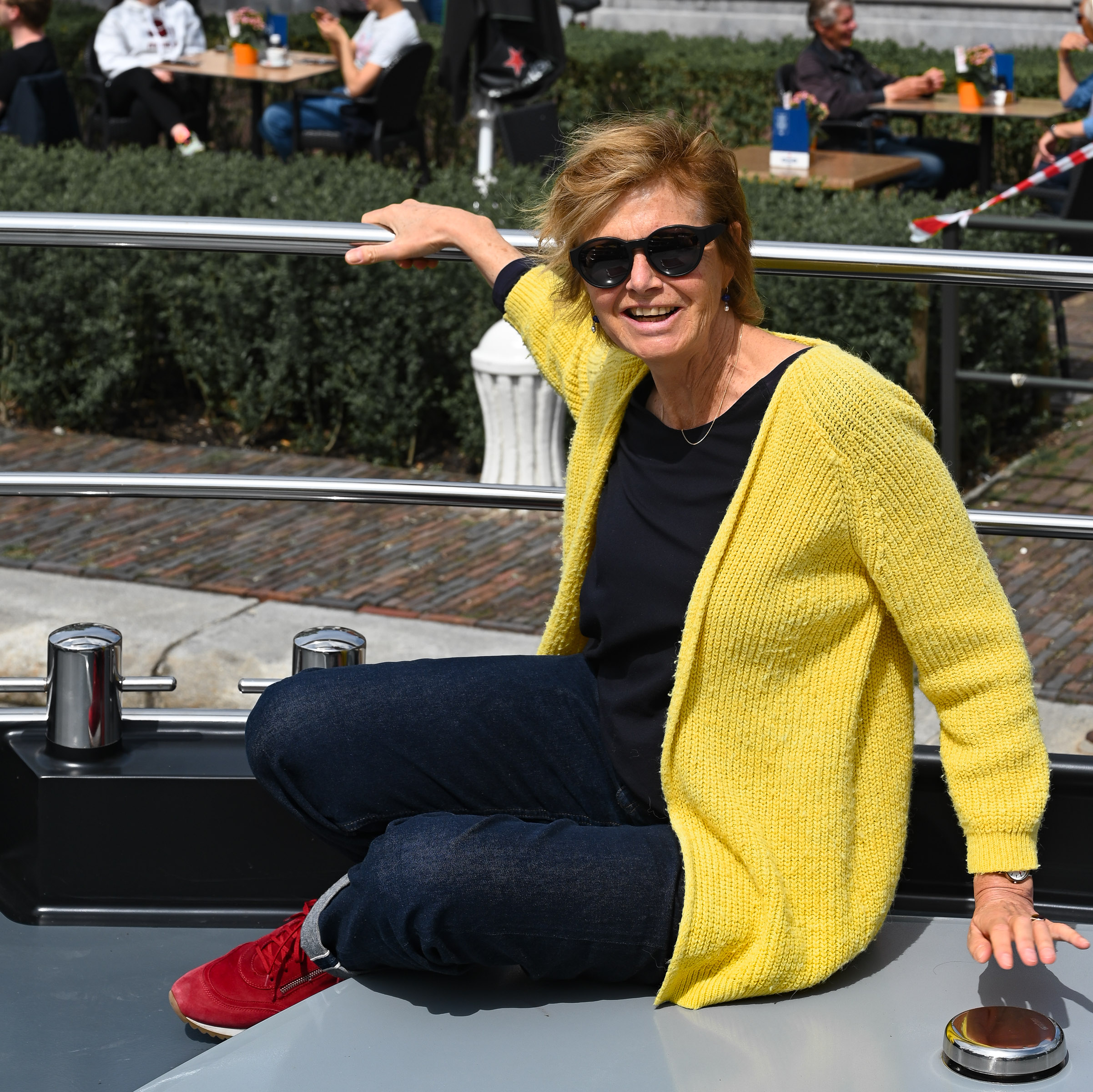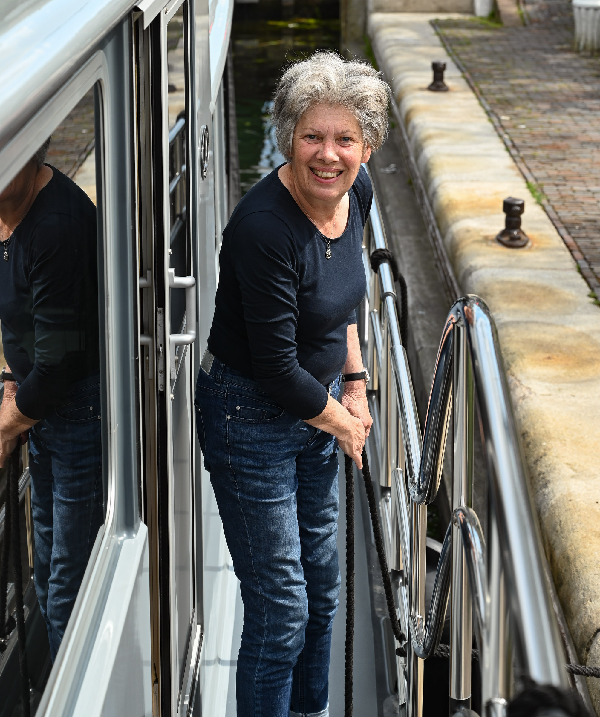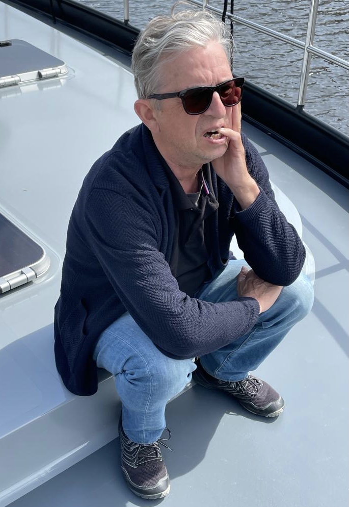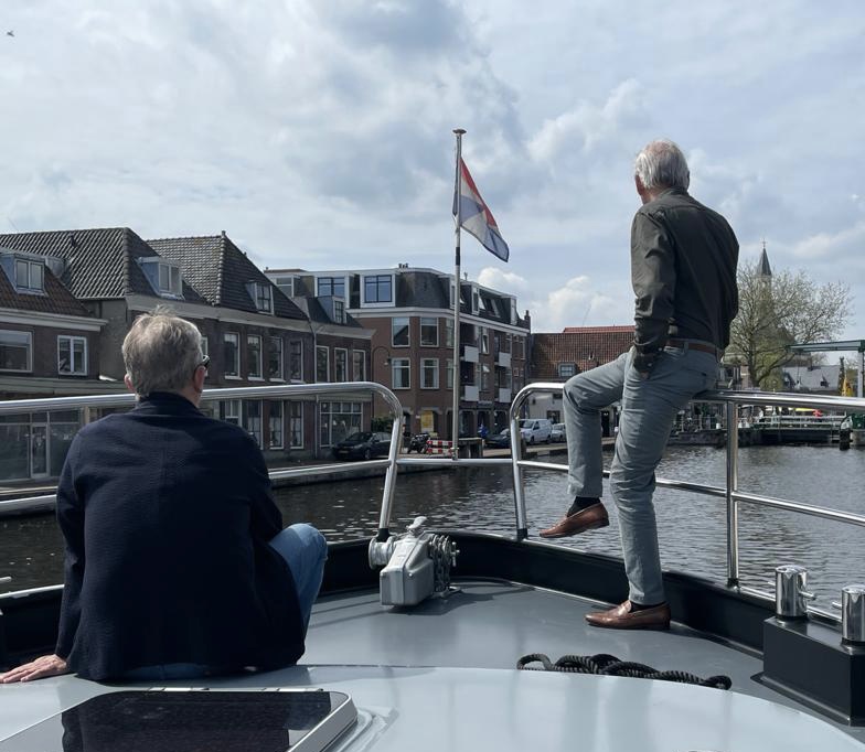 Eind van de regenachtige zaterdag stomen we verder naar de Kaag. We hebben een afspraak met John, Ria haar buurjongen van 50 jaar geleden. Hij heeft een zomerhuisje aan de Kaag met prachtig uitzicht over een van de plassen. We mogen aan een ponton, vlak bij zijn huisje aanmeren. Onder het genot van een fles witte wijn praten we bij over de wederzijdse moeders die vriendinnen van elkaar waren en natuurlijk over de wederzijdze levensgeschiedenis. Aan eten komen we niet toe. Zondag varen we met John in zijn rubber boot naar het bijgelegen restaurant en drinken daar koffie met koek in het zonnetje. Zondagmiddag doen we een uurtje over het stukje van de Kaag naar de Haven van Leiden. De volgende dag bezoek ik John zijn atelier. Leuk om hem hier aan het werk te zien en te praten over het fotografenvak. Hij maakt een paar portretten van me omdat hij dat leuk voor Ria vindt. John werkt prachtig en subtiel met licht. Leuke kennismaking met deze buurjongen die we via Facebook weer opnieuw hebben ontdekt.