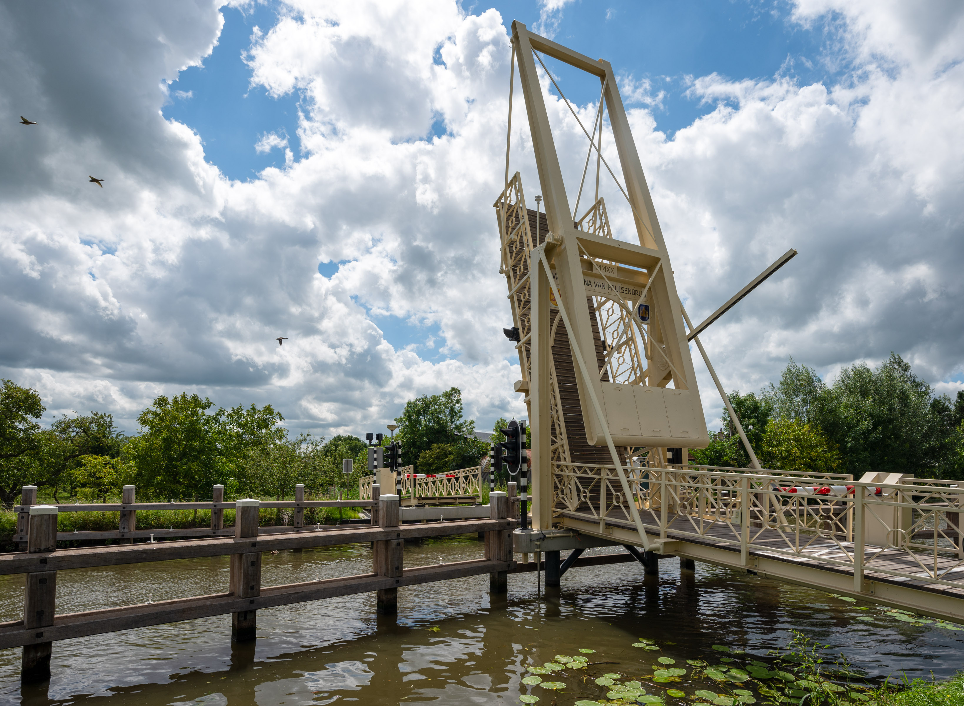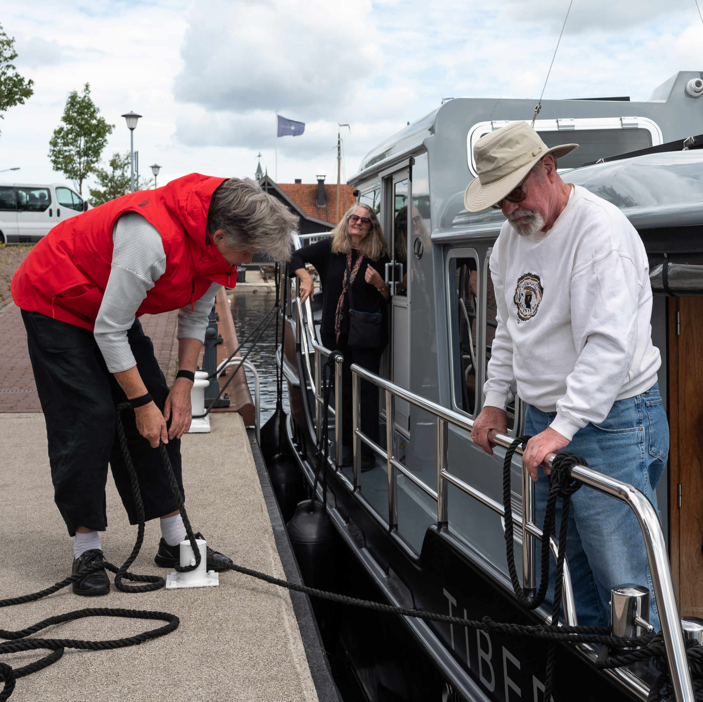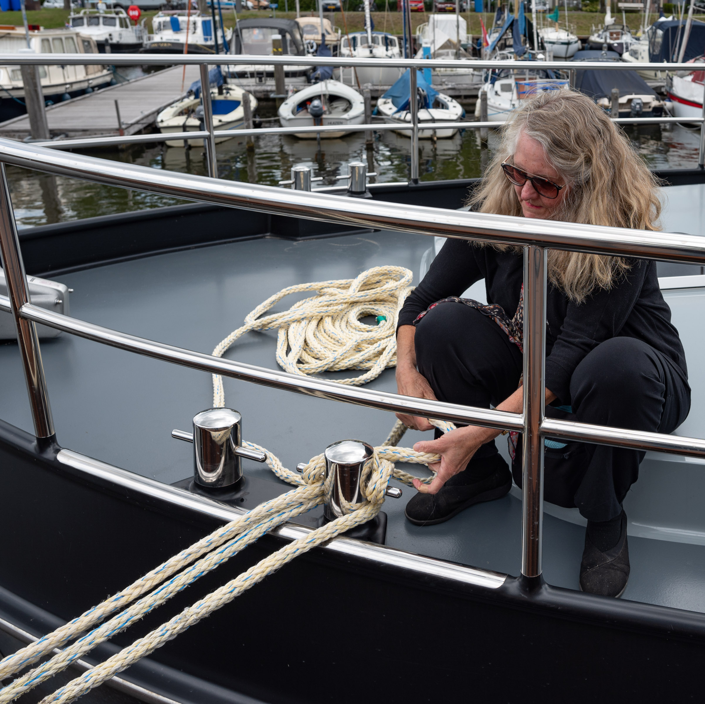 We lagen aan een laag steiger in de Brede Haven. Met naast ons een hoge kademuur, zoals je die door heel ’s Hertogenbosch ziet. Met een heel steile trap van 4 meter hoog naar boven. Ik ben er een keer op geklommen, op mijn achterwerk. Terug achterstevoren er weer af. De volgende dag was het weer extra waardeloos met mijn knieën. Dit is niks, dit moet anders. We vroegen de havenmeester of er misschien ook een plekje met een helling was. Ja, aan de andere kant van de brug had hij wel een extra brede box voor ons. Dat zou moeten passen. We kleedden ons snel aan voordat het plekje weer weg zou zijn…. Aad haalde de lijnen en stootwillen aan de voorzijde al weg, zodat ik mijn knieën kon ontlasten. En ik ging achter in de kuip kijken. We moesten achteruit onder de brug door. Het was nl. zo smal dat we niet konden keren. Zo ontzettend knap van Aad dat hij met de boot achteruit kan varen, bijna zoals hij ook met een auto rijdt.