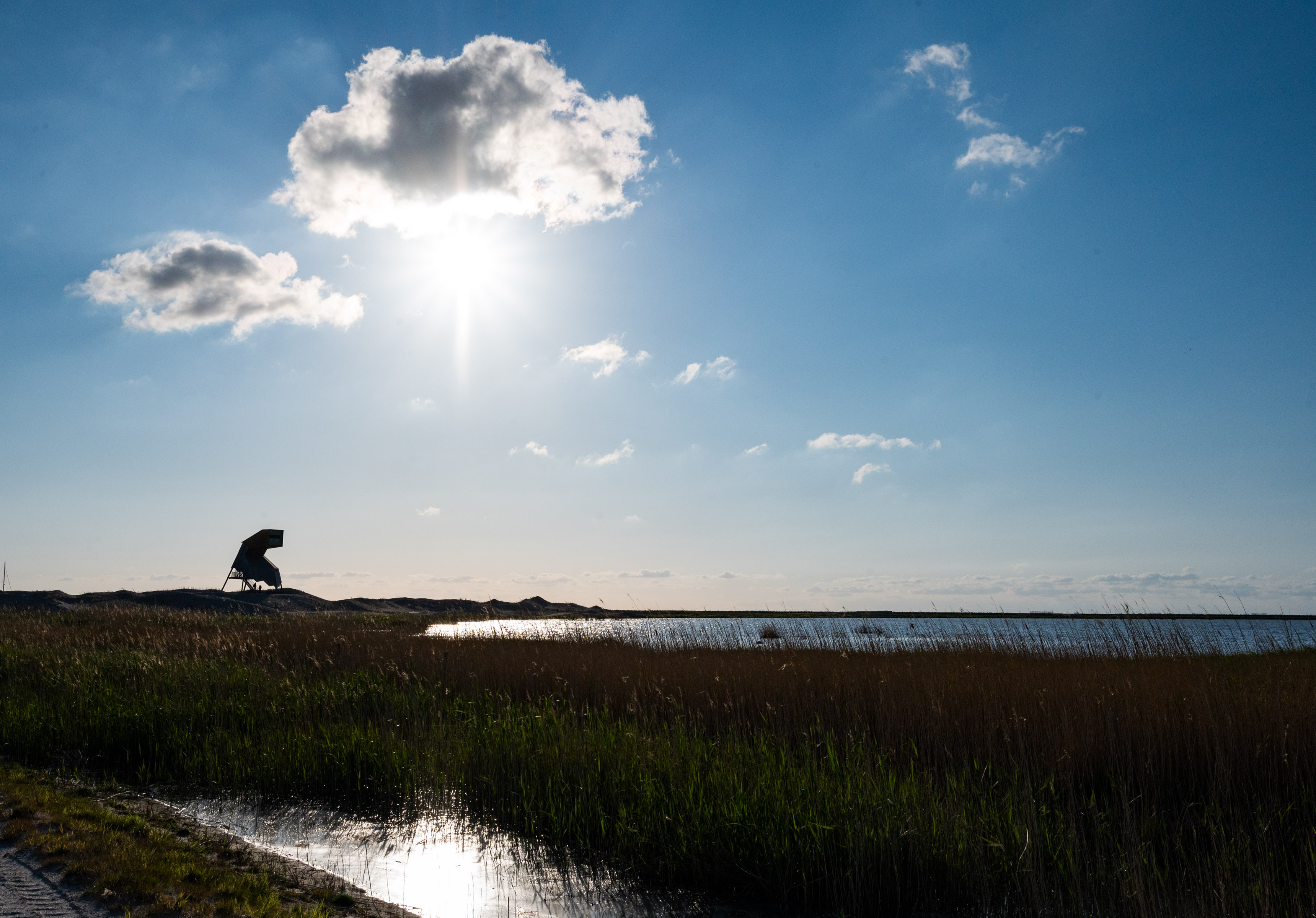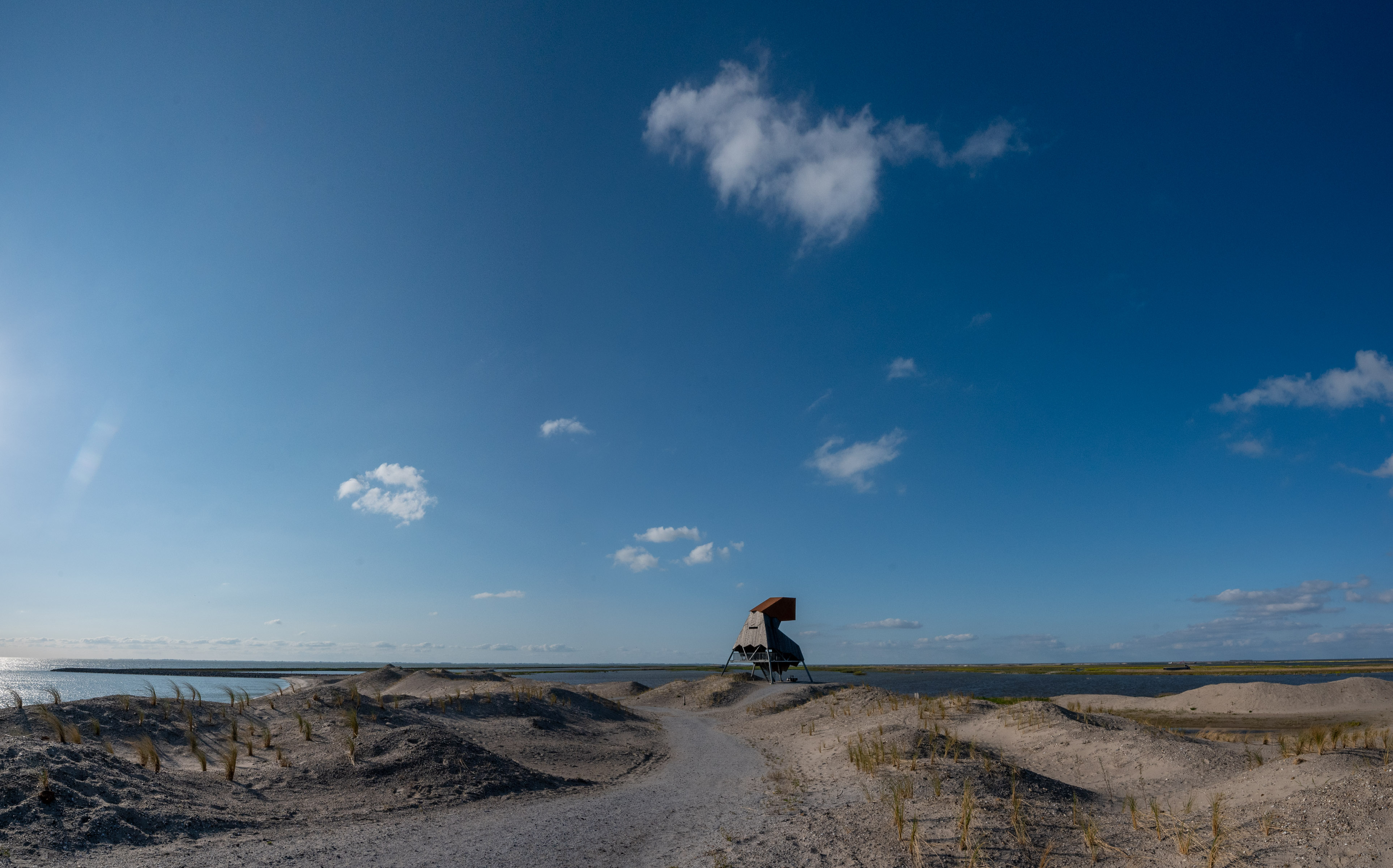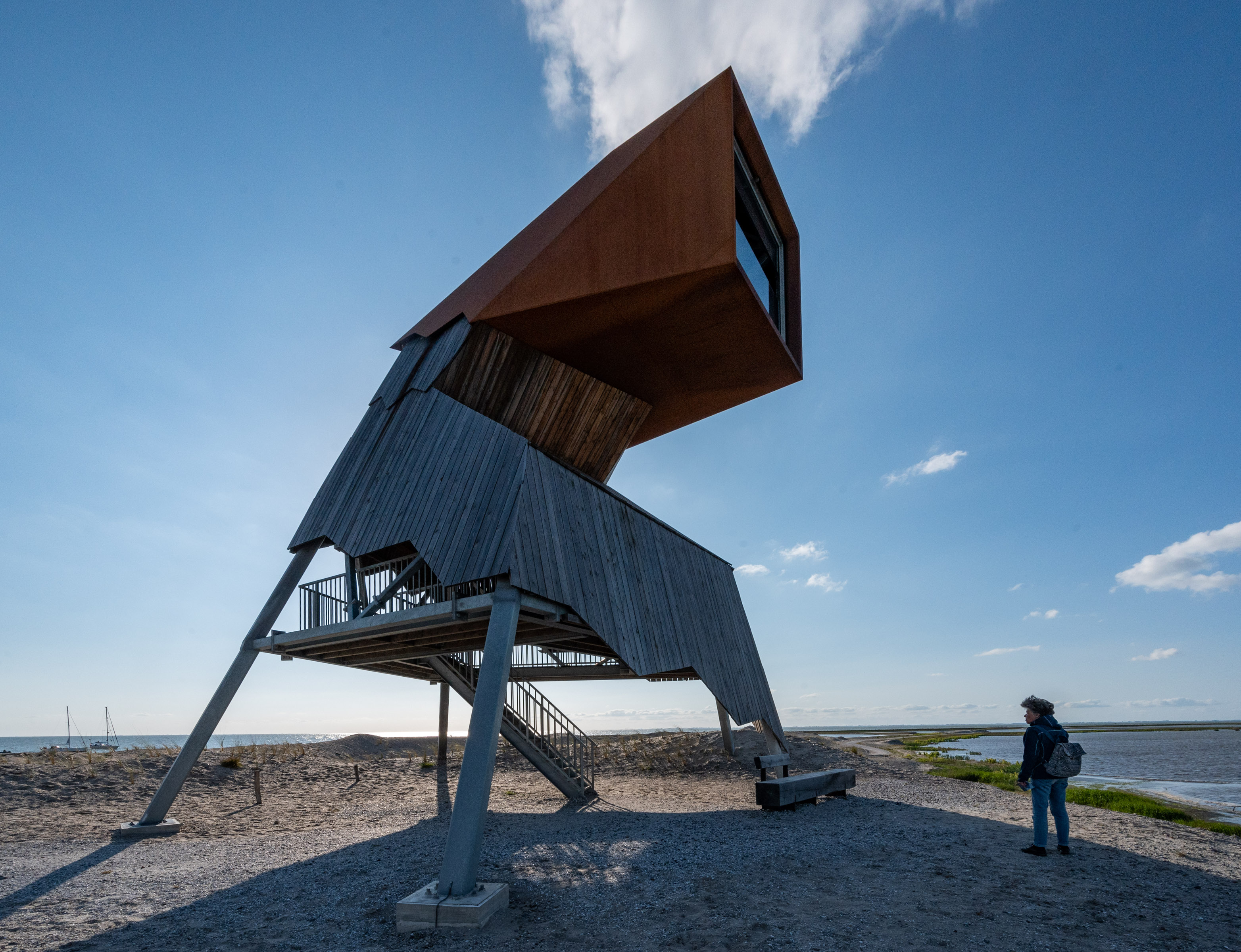 De Marker Wadden zijn mooi. Nog maar zo jong en dan al zo mooi. Wat zandduinen, enkele slik-plassen, hier en daar wat moerasandijvie, plus een oneindige horizon en er is weer een nieuw paradijs op aarde. De vogels vinden het sowieso geweldig. Er wordt driftig gebouw aan wat huisjes en enkele servicegebouwen. Allemaal in de zelfde stijl. Prachtig vergrijzend hout, maar nu nog grotendeels oranje-geel. En een prachtige folie als uitkijkpost waarvan ik maar niet genoeg krijg om hem te fotograferen. Tot aan zonsondergang toe. Alleen jammer dat ik met mijn stomme kop, de zonsondergang-foto’s, gisteravond met uiterste inspanning, in de kille noorder wind genomen, vanmorgen heb gewist. Dus jullie moeten maar je fantasie gebruiken. Het is nog rustig op de Wadden. Grote groepen, met charters aangevoerd, zijn nog niet toegestaan. En we liggen allemaal enkel aan de paar steigers die er zijn. Allemaal vriendelijke mensen. Van ons soort.