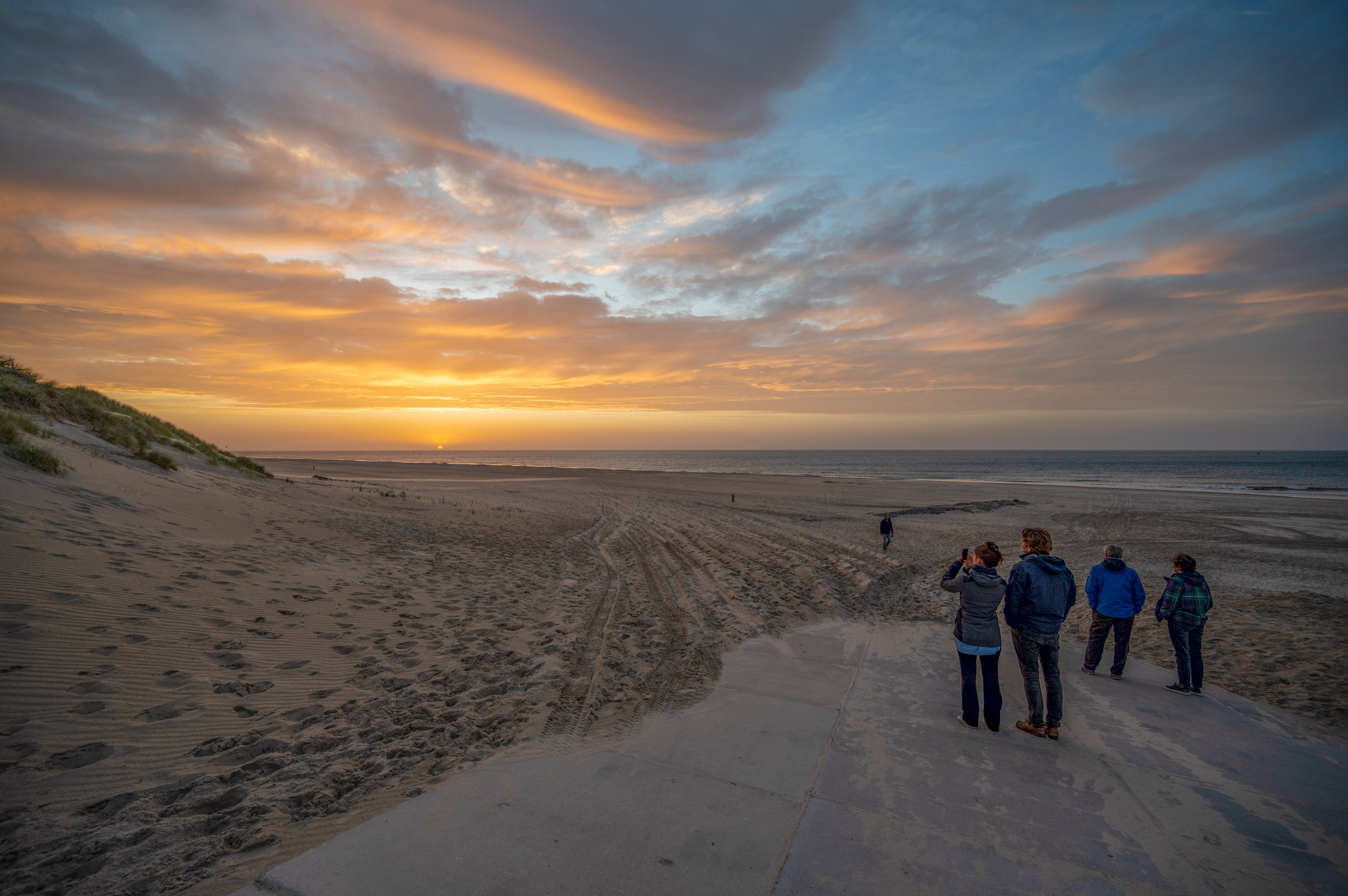 Gisteravond heb ik de zon vanaf het duin een hele zachte oranje-roode landing zien maken. Hier gaat de zon net op het randje van het strand in het kleine zeetje onder. Op de terugweg naar de haven kleurde de lucht rosé/rood op een zachtblauwe ondergrond.