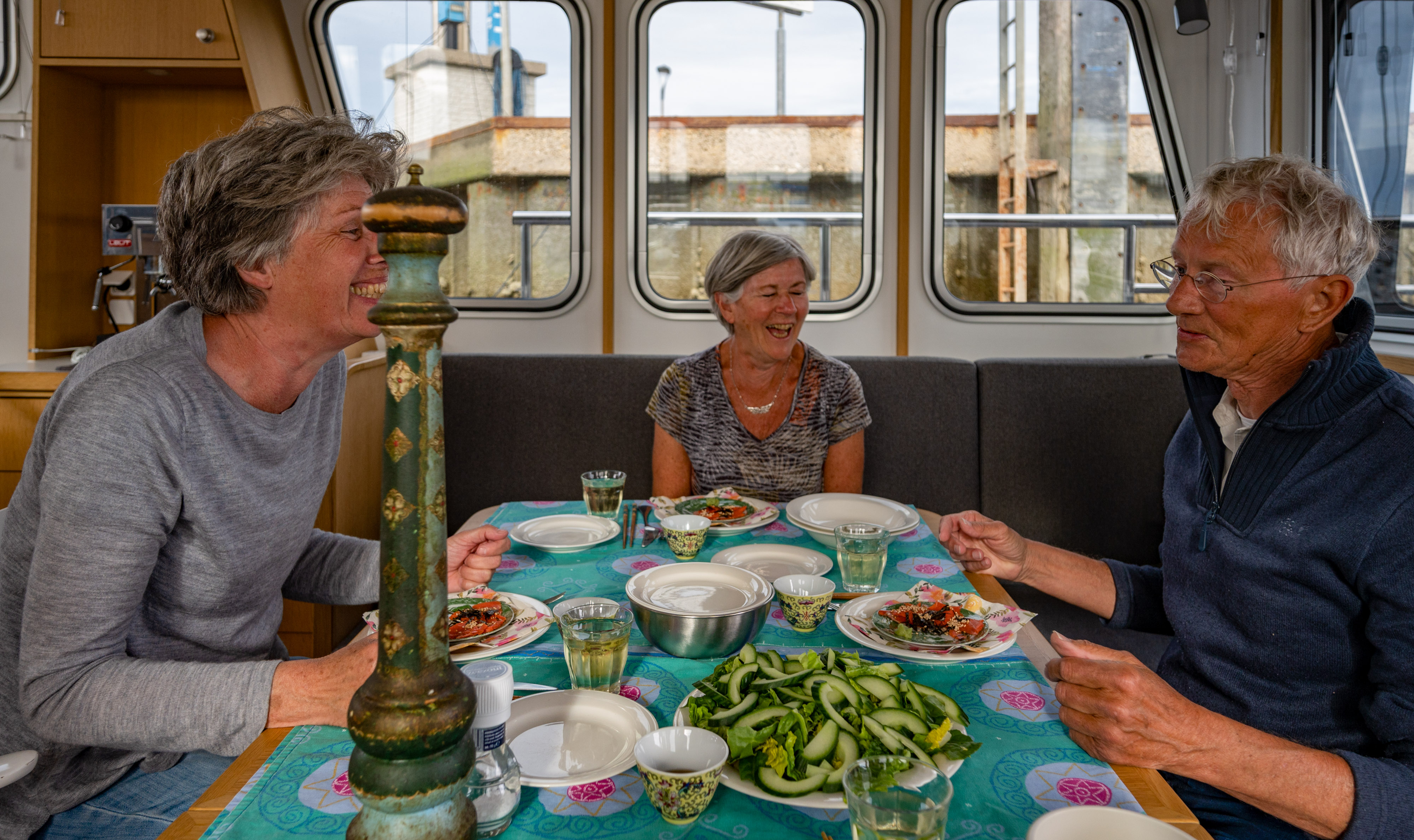 We eten met elkaar, op afstand natuurlijk en wat is het gezellig! De dag erna bellen Willem en Syl, zij zijn in de buurt van Leeuwarden en onderweg naar Dokkum; het moet niet gekker worden. Ook zij leggen aan bij de Marrekriteplek en we hebben met z’n zessen de meest leuke avond met elkaar sinds de uitbraak en het isolement door het Coronavirus. Wat hebben we dat gemist: met elkaar aan tafel en lachen. Heerlijk. Dat geeft weer hernieuwde energie.