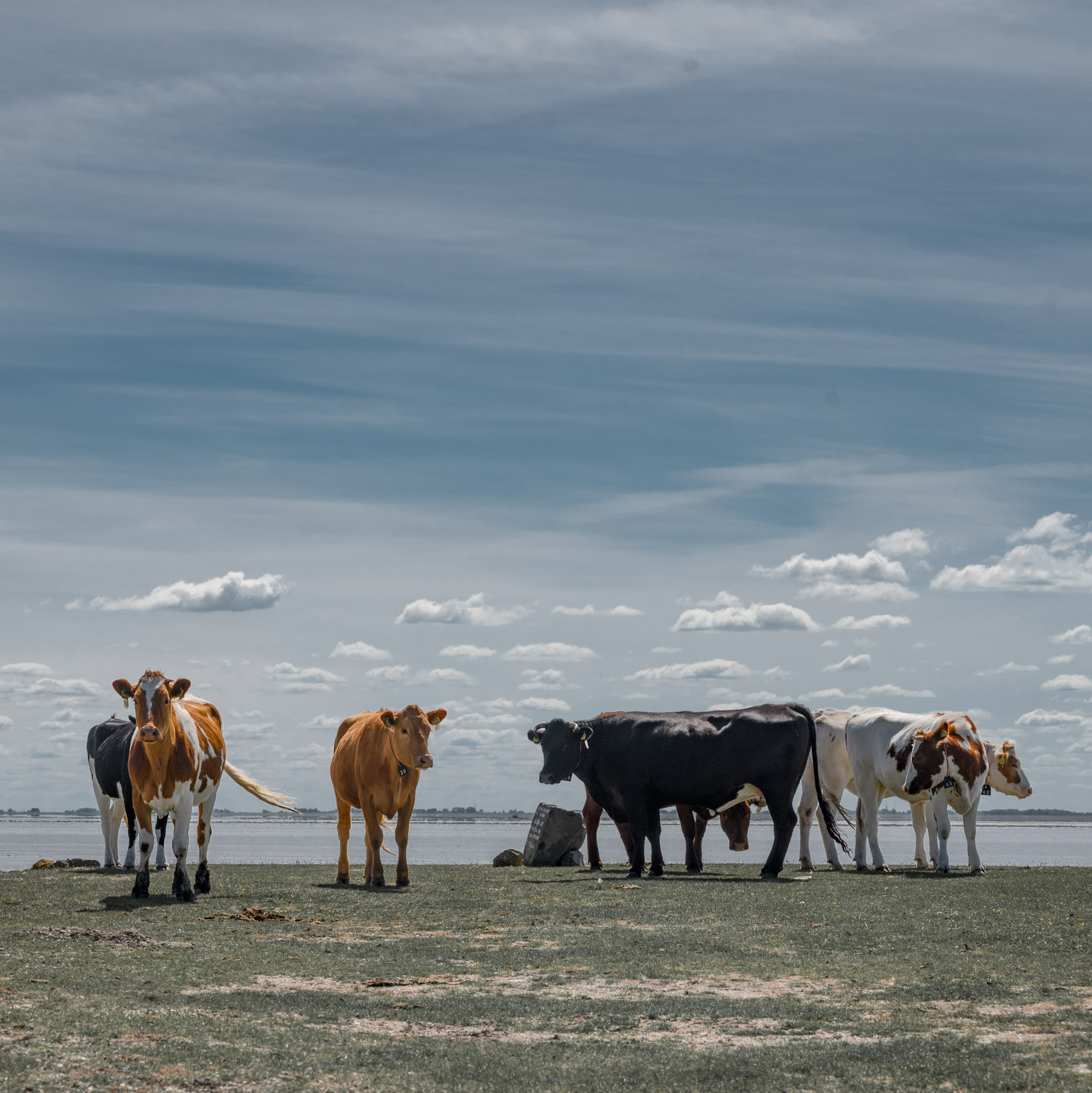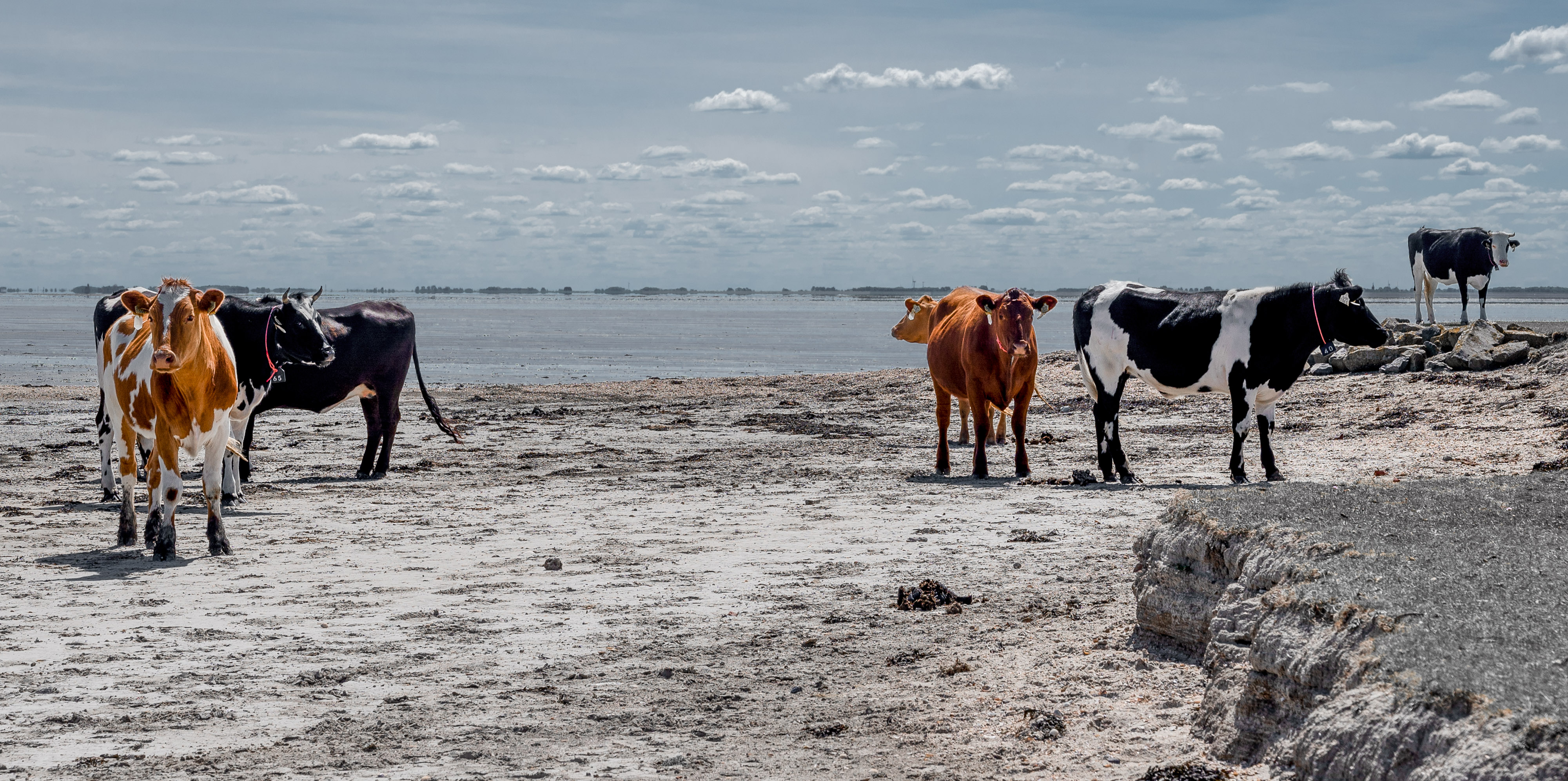 De mooiste wandeling was wel naar het Nieuwlandsreid, aan de oostkant van Ameland. Dit gebied wordt, van vader op zoon, aan een paar boeren verpacht die er schapen of koeien laten grazen. Aan het eind van de 19e eeuw was het Nieuwlandsreid een stuivende zandvlakte waarop duinen zich vormden. Het gebied had toen nog te lijden van overstromingen van de Noord- en Waddenzee. In 1893 werd de Kooi-oerdstuifdijk aangelegd waardoor de opening van de Noordzee was afgesloten. Zo werd de open zandvlakte een zoute eilandkwelder. Door het Nieuwlandsreid stromen een paar slenken die uitkomen in de Waddenzee. Wanneer de kwelder na een hoge vloed helemaal onder water heeft gestaan, veranderen ze in een snelstromende watermassa. Wij lopen, met een paar jonge stieren langs een van de slenken naar het Wad. Dat levert een prachtig gezicht op, die herkauwende stieren aan de waterkant in het slik.