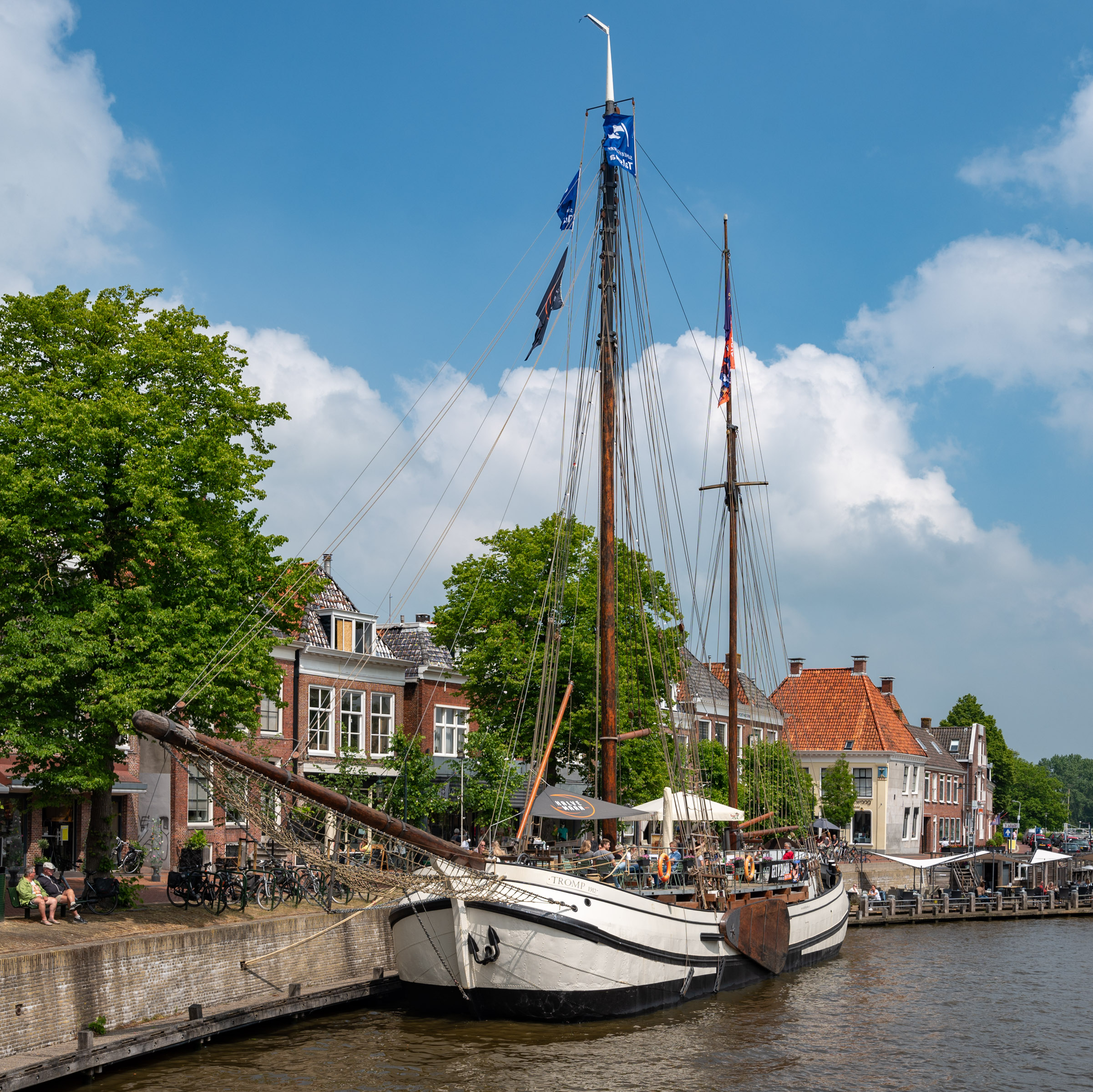 Nu zijn we weer aan land, varen weer op zoet water, geen eb en vloed. Een wereld van verschil. Eerst hebben we een paar dagen aan een klein steigertje in het Lauwersmeer gelegen en een mooie wandeling gemaakt. Even bijkomen want het varen op de wantijen is behoorlijk inspannend. Tussen het riet dachten we eerst dat de boot een soort alarmpje gaf, begrepen niets van het brommetje. Bleek het de roep van de roerdomp te zijn. Nooit eerder gehoord. En nu dus in Dokkum. Je weet wel :Bonifatius in 754 in Dokkum vermoord. Maar geen nood, alhoewel je hier af en toe een wilde blonde Fries tegenkomt, is Dokkum een pittoresk leuk vestingstadje. Hier blijven we een paar dagen, doen eindelijk weer boodschappen. Nog steeds gelden de coronamaatregelen. De supermarkt mag je niet met z’n tweetjes in. Handen ontsmetten, afstand houden. Het is een hele dans van klanten en personeel om elkaar maar niet voor de voeten te lopen. Niet zomaar even iets pakken, je snel omdraaien omdat je iets bent vergeten. Het is een bizarre tijd. Langzaam maar zeker kunnen we wel wat vrienden ontmoeten maar, er wordt niet geknuffeld. Alleen een elleboog en verder ieder op een hoek van de tafel.